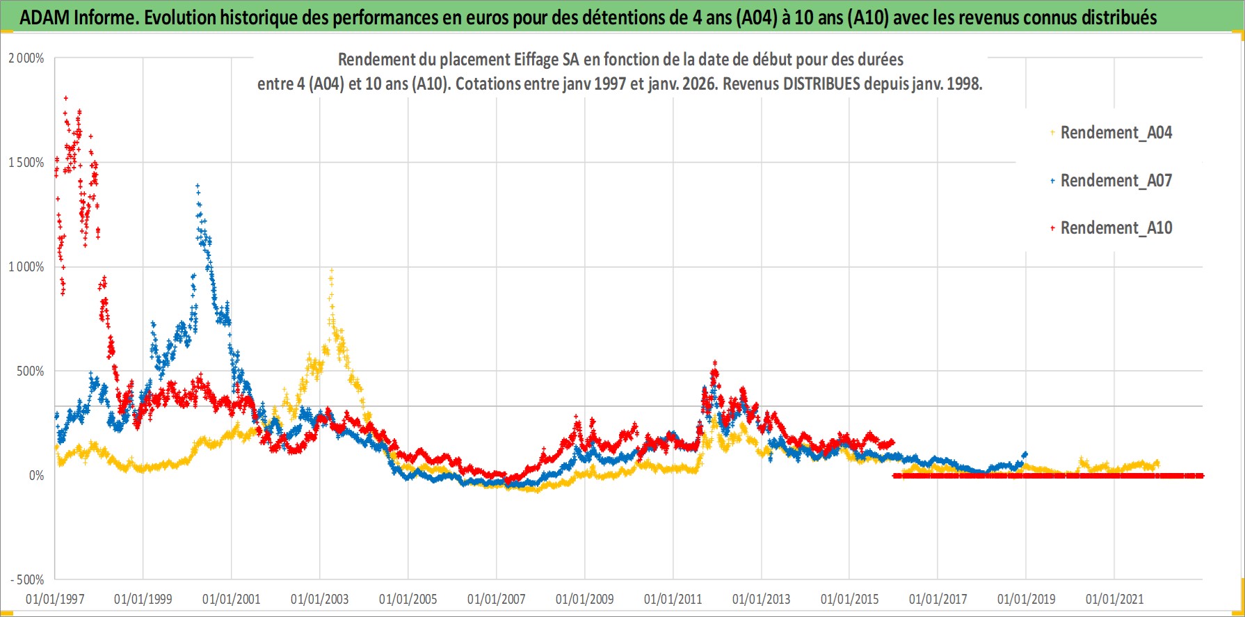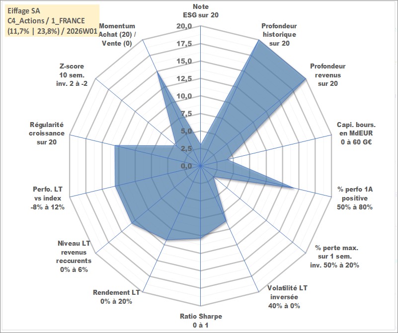 Site dédié aux investisseursPage dédiée sur site financeAnalyse des valorisations hebdomadaires de l'action Eiffage SA. Cet actif est cote en EUR. Les valorisations couvrent les semaines 1997W01 a 2026W01. Les revenus de cet actif financier sont pris en compte depuis la semaine 1998W01. La note globale ESG de cet actif est estimee a 3.0 (apres rebasage entre 0 et 20).