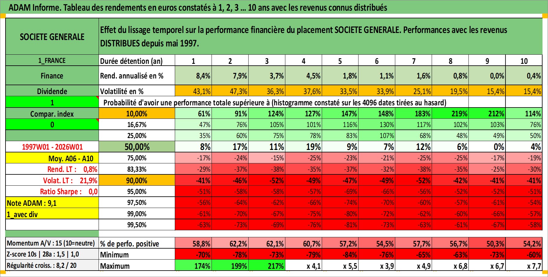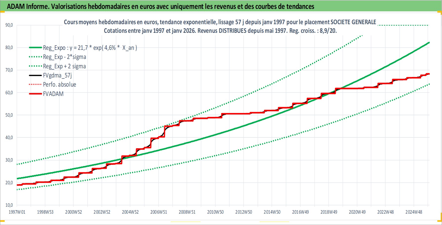 Site dédié aux investisseursPage dédiée sur site financeAnalyse des valorisations hebdomadaires de l'action SOCIETE GENERALE. Cet actif est cote en EUR. Les valorisations couvrent les semaines 1997W01 a 2026W01. Les revenus de cet actif financier sont pris en compte depuis la semaine 1997W21. La note globale ESG de cet actif est estimee a 10.0 (apres rebasage entre 0 et 20).