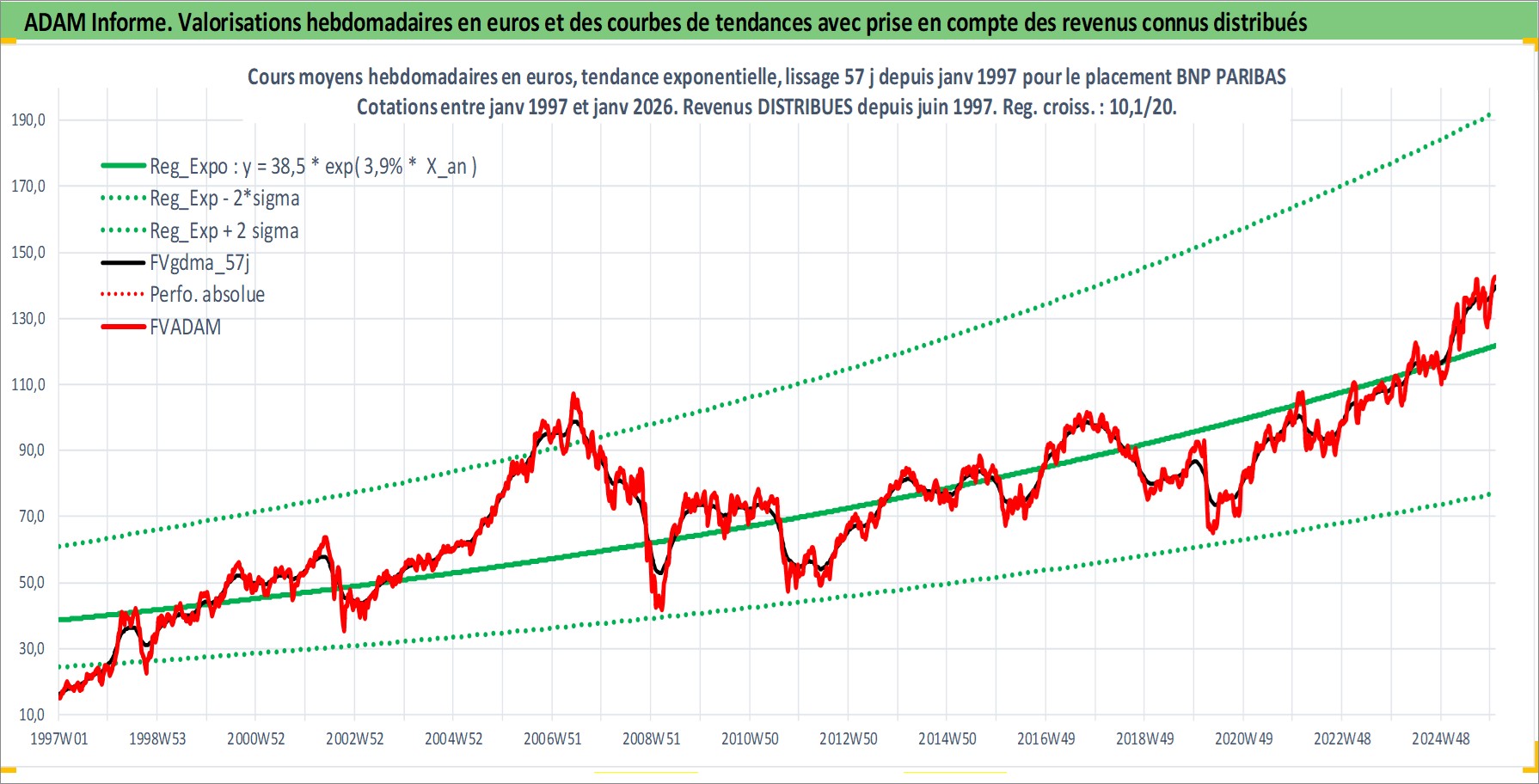 Site dédié aux investisseursPage dédiée sur site financeAnalyse des valorisations hebdomadaires de l'action BNP PARIBAS. Cet actif est cote en EUR. Les valorisations couvrent les semaines 1997W01 a 2026W01. Les revenus de cet actif financier sont pris en compte depuis la semaine 1997W24. La note globale ESG de cet actif est estimee a 7.0 (apres rebasage entre 0 et 20).