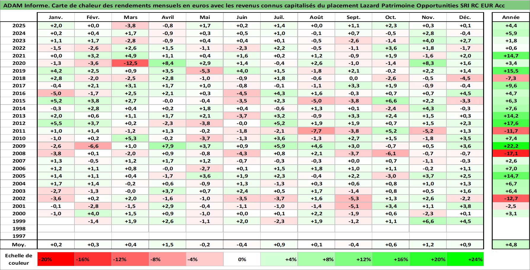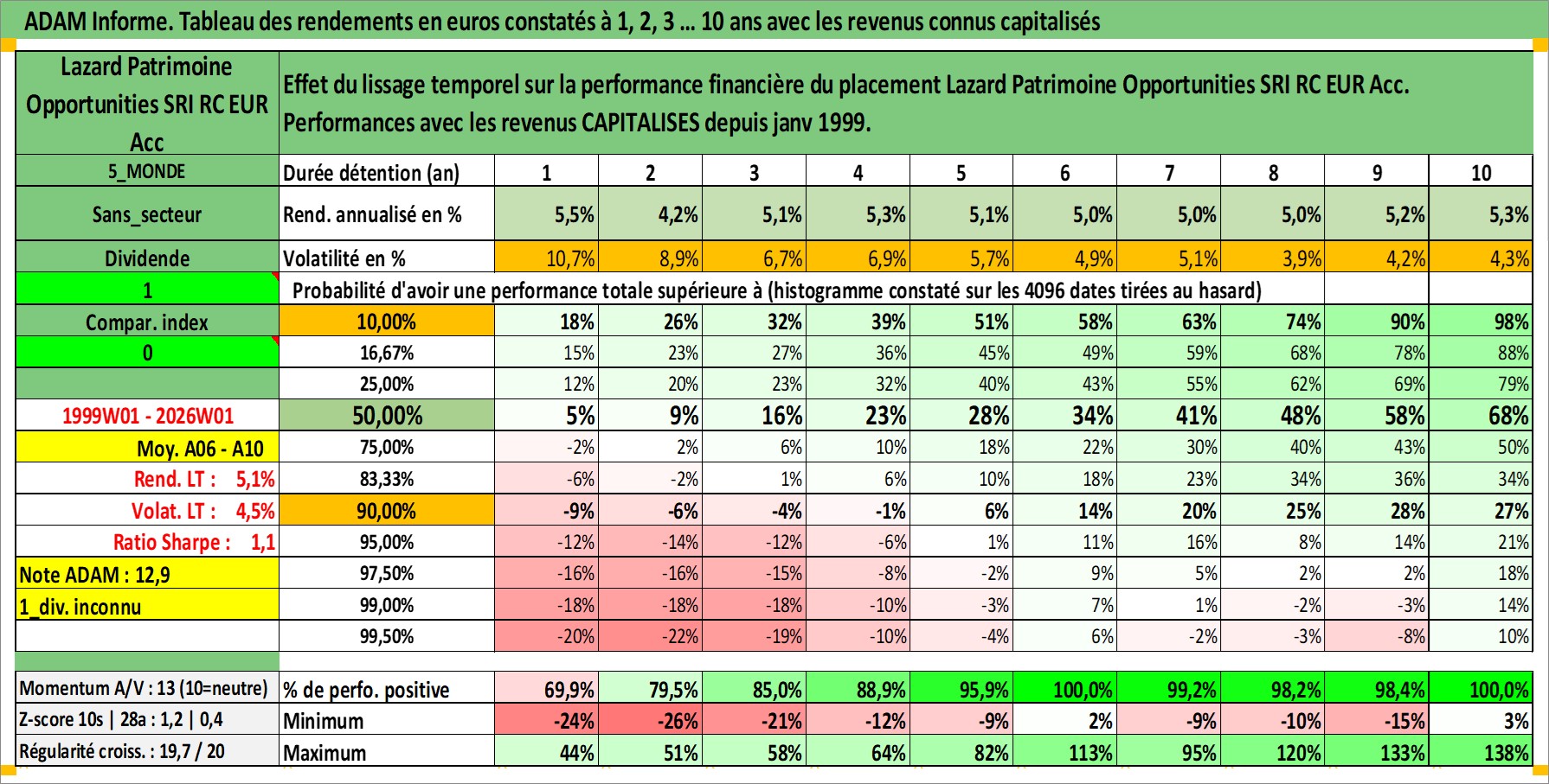 Site dédié aux investisseursPage dédiée sur site financeAnalyse des valorisations hebdomadaires du fonds Lazard Patrimoine Opportunities SRI RC EUR Acc. Cet actif est cote en EUR. Les valorisations couvrent les semaines 1999W01 a 2026W01. Les revenus de cet actif financier sont pris en compte depuis la semaine 1999W01. La note globale ESG de cet actif est estimee a 9.0 (apres rebasage entre 0 et 20).