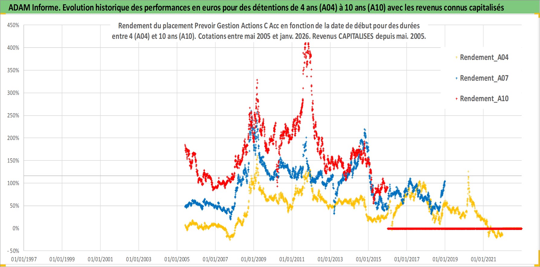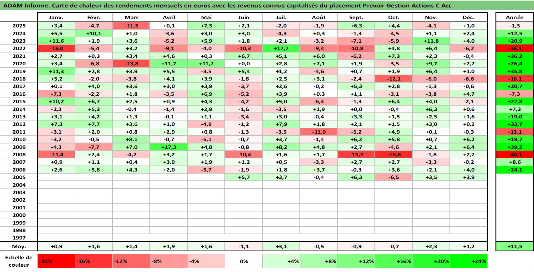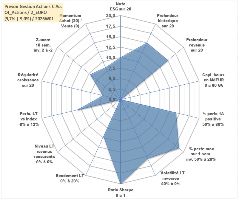 Site dédié aux investisseursPage dédiée sur site financeAnalyse des valorisations hebdomadaires du fonds Prevoir Gestion Actions C Acc. Cet actif est cote en EUR. Les valorisations couvrent les semaines 2005W21 a 2026W01. Les revenus de cet actif financier sont pris en compte depuis la semaine 2005W21. La note globale ESG de cet actif est estimee a 10.0 (apres rebasage entre 0 et 20).