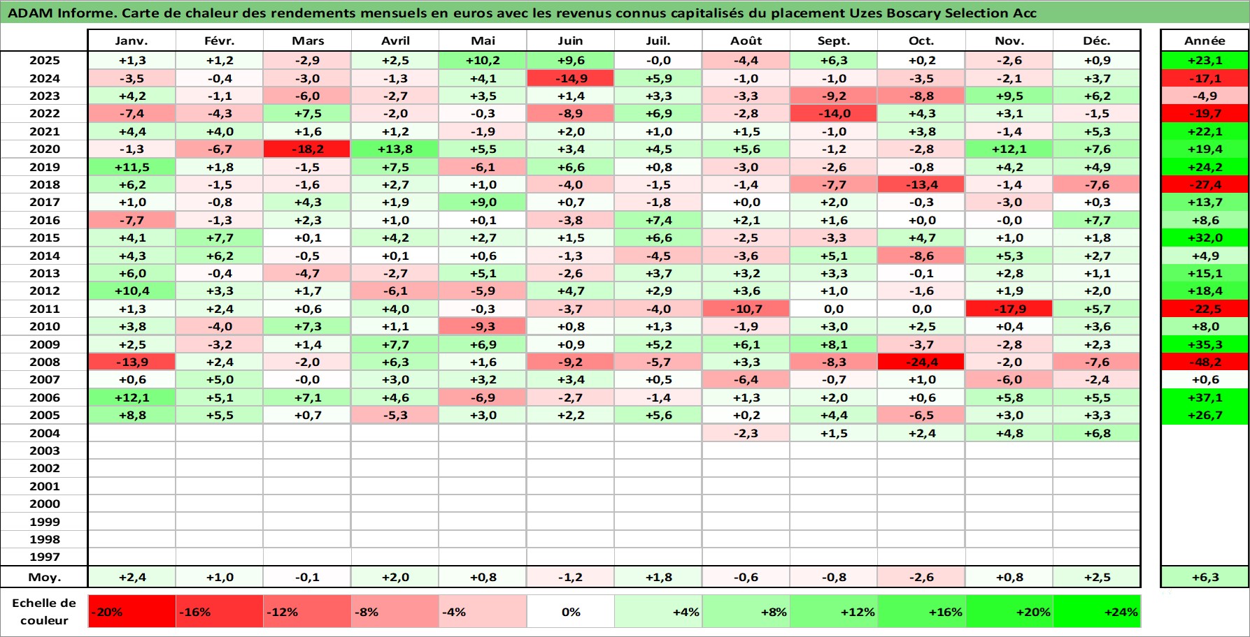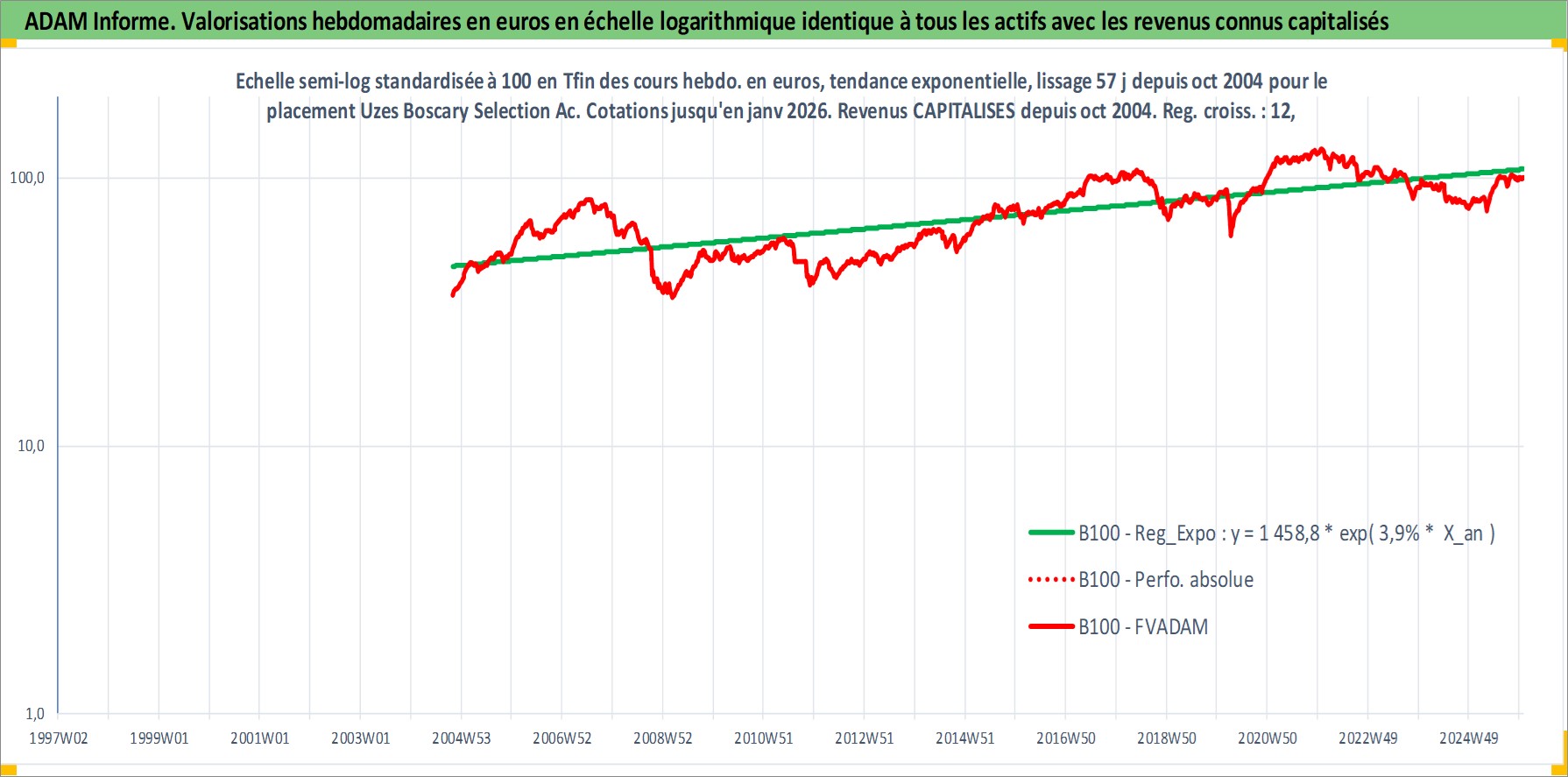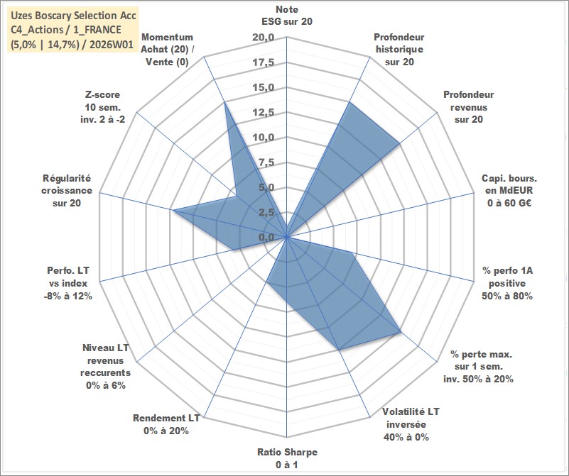 Site dédié aux investisseursPage dédiée sur site financeAnalyse des valorisations hebdomadaires du fonds Uzes Boscary Selection Acc. Cet actif est cote en EUR. Les valorisations couvrent les semaines 2004W44 a 2026W01. Les revenus de cet actif financier sont pris en compte depuis la semaine 2004W44. La note globale ESG de cet actif est estimee a 1.0 (apres rebasage entre 0 et 20).