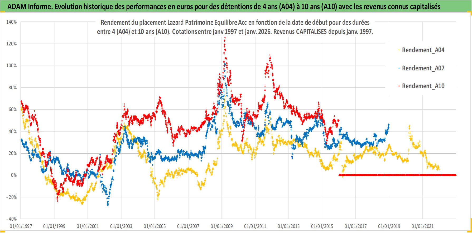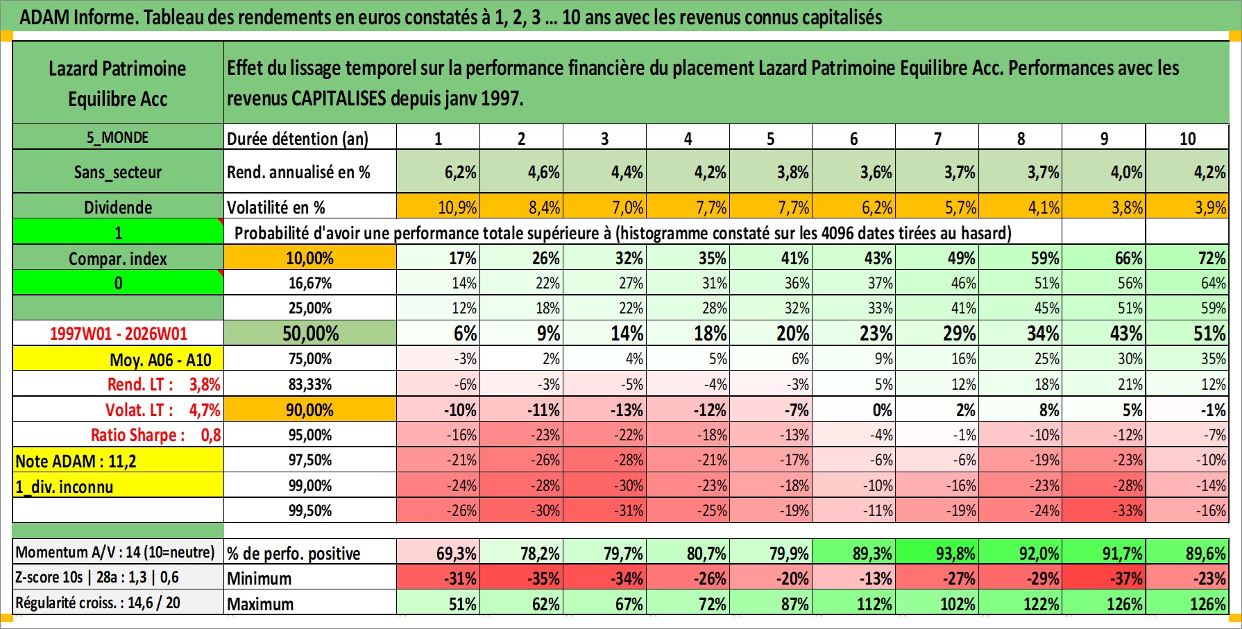 Site dédié aux investisseursPage dédiée sur site financeAnalyse des valorisations hebdomadaires du fonds Lazard Patrimoine Equilibre Acc. Cet actif est cote en EUR. Les valorisations couvrent les semaines 1997W01 a 2026W01. Les revenus de cet actif financier sont pris en compte depuis la semaine 1997W01. La note globale ESG de cet actif est estimee a 9.0 (apres rebasage entre 0 et 20).
