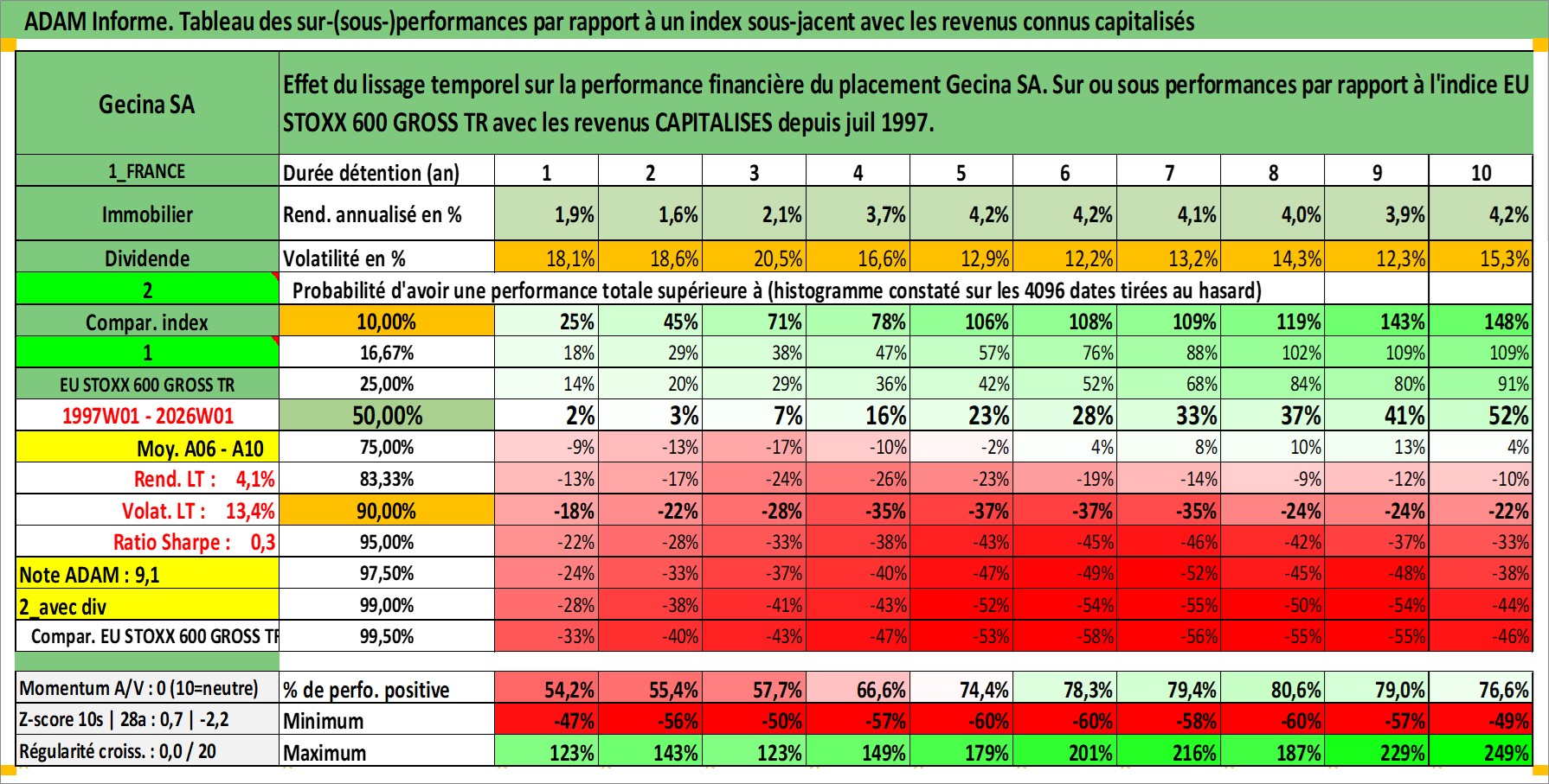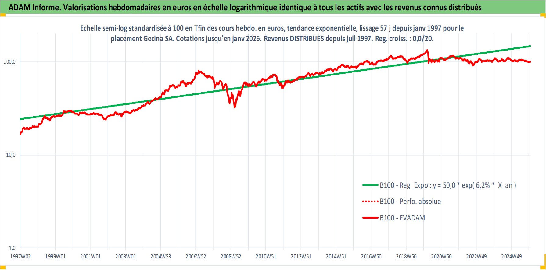 Site dédié aux investisseursPage dédiée sur site financeAnalyse des valorisations hebdomadaires de l'action Gecina SA. Cet actif est cote en EUR. Les valorisations couvrent les semaines 1997W01 a 2026W01. Les revenus de cet actif financier sont pris en compte depuis la semaine 1997W30. La note globale ESG de cet actif est estimee a 17.0 (apres rebasage entre 0 et 20).