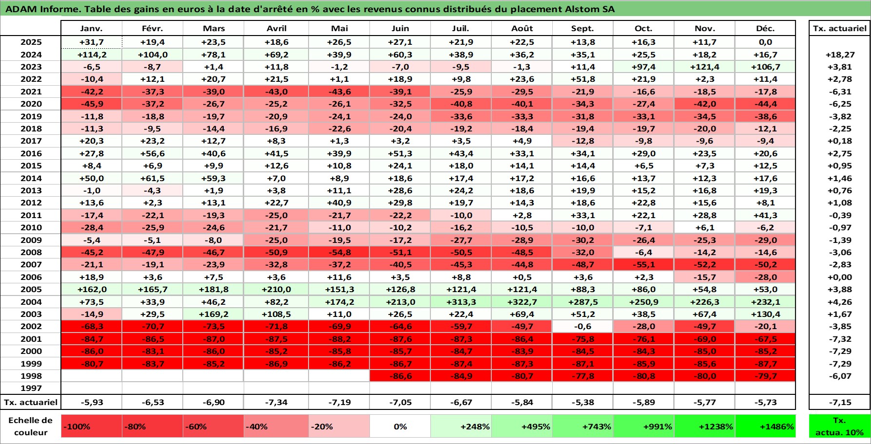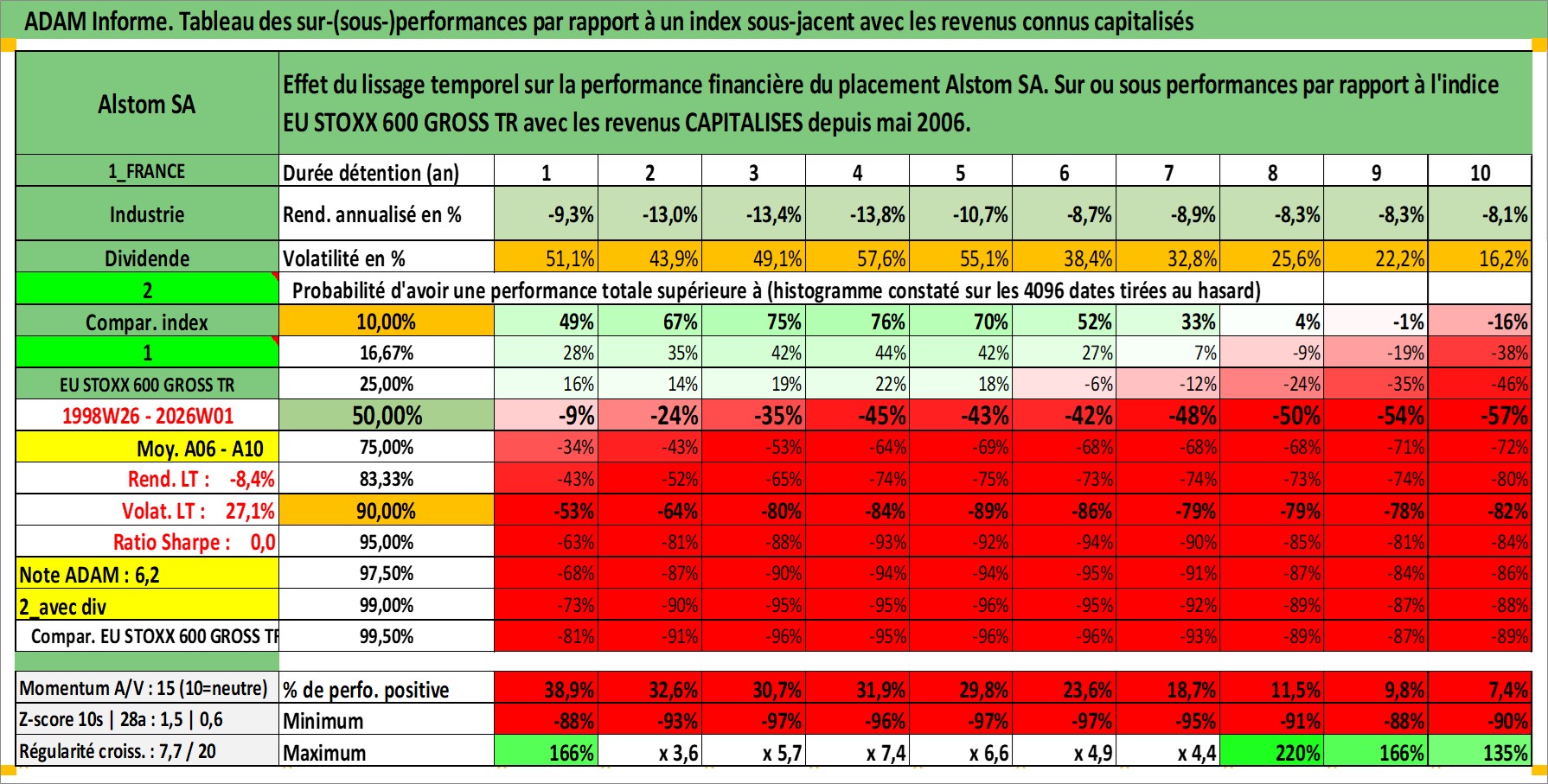 Site dédié aux investisseursPage dédiée sur site financeAnalyse des valorisations hebdomadaires de l'action Alstom SA. Cet actif est cote en EUR. Les valorisations couvrent les semaines 1998W26 a 2026W01. Les revenus de cet actif financier sont pris en compte depuis la semaine 2006W20. La note globale ESG de cet actif est estimee a 11.0 (apres rebasage entre 0 et 20).