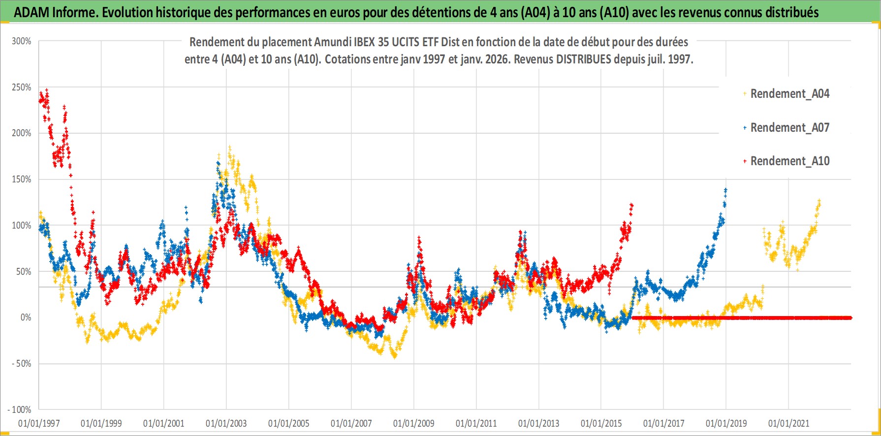Site dédié aux investisseursPage dédiée sur site financeAnalyse des valorisations hebdomadaires du fonds Amundi IBEX 35 UCITS ETF Dist. Cet actif est cote en EUR. Les valorisations couvrent les semaines 1997W01 a 2026W01. Les revenus de cet actif financier sont pris en compte depuis la semaine 1997W28. La note ESG de cet actif n'est pas connue.