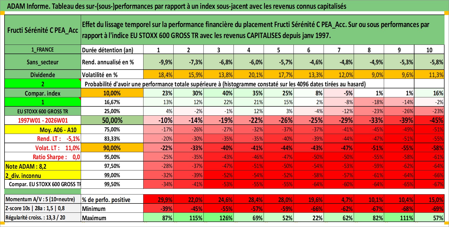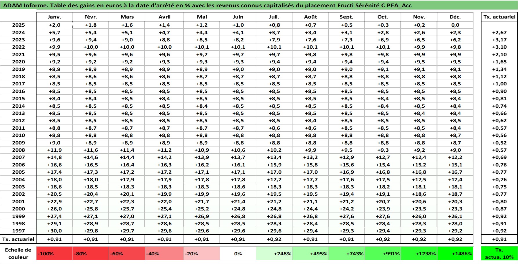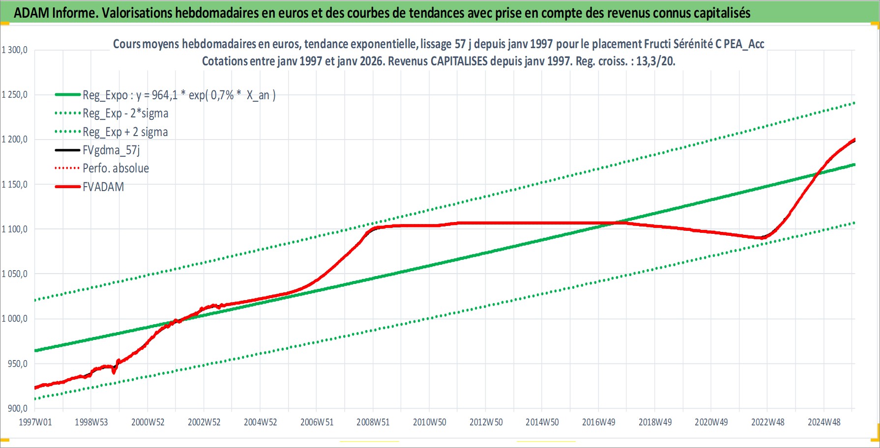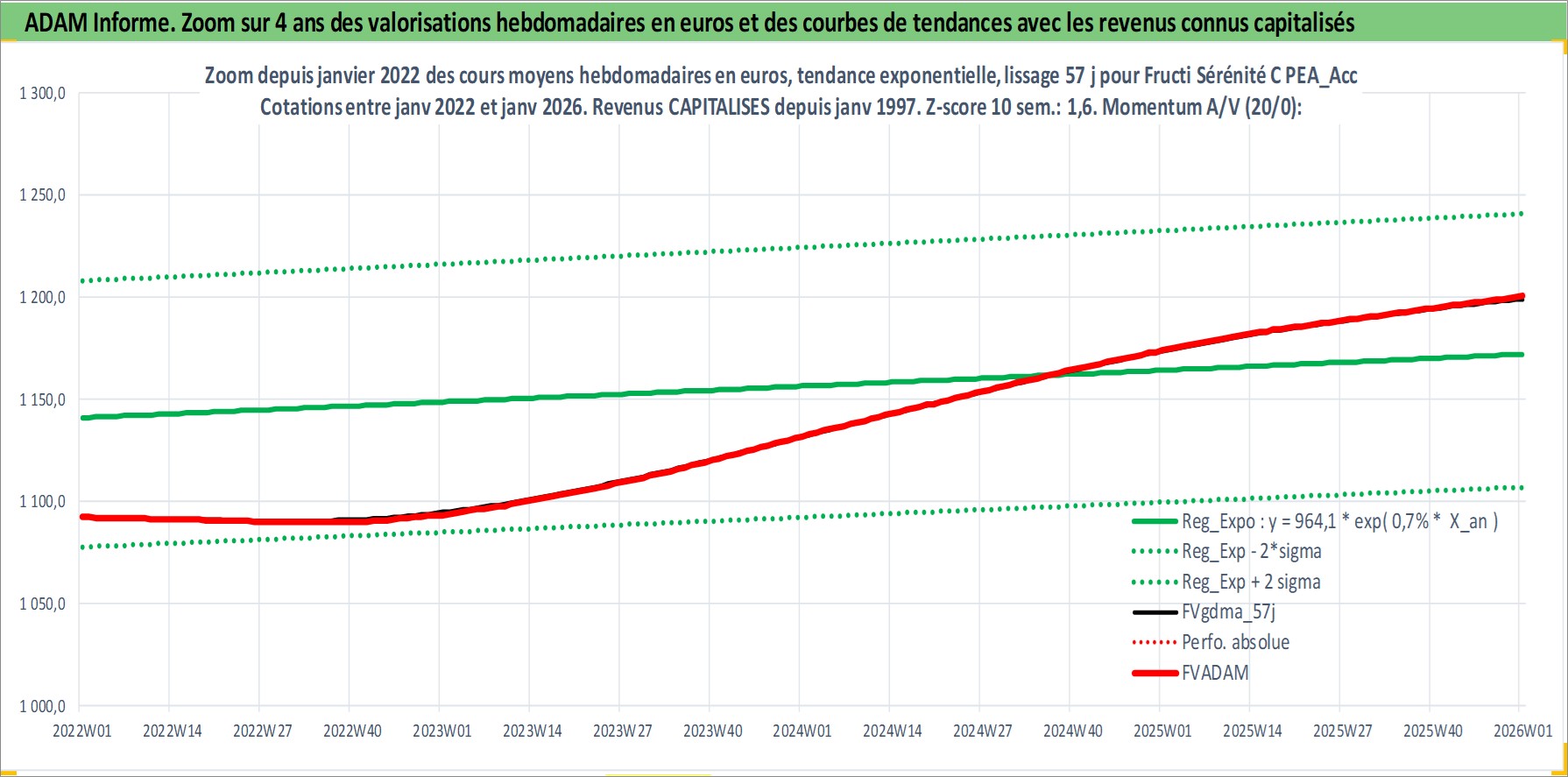 Site dédié aux investisseursPage dédiée sur site financeAnalyse des valorisations hebdomadaires du fonds Fructi Sérénité C PEA_Acc. Cet actif est cote en EUR. Les valorisations couvrent les semaines 1997W01 a 2026W01. Les revenus de cet actif financier sont pris en compte depuis la semaine 1997W01. La note ESG de cet actif n'est pas connue.