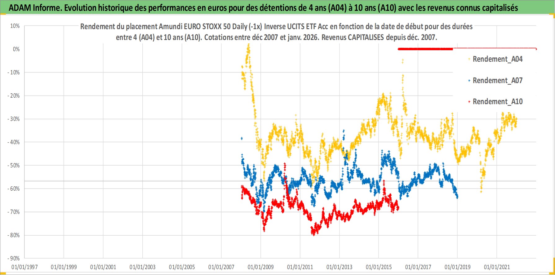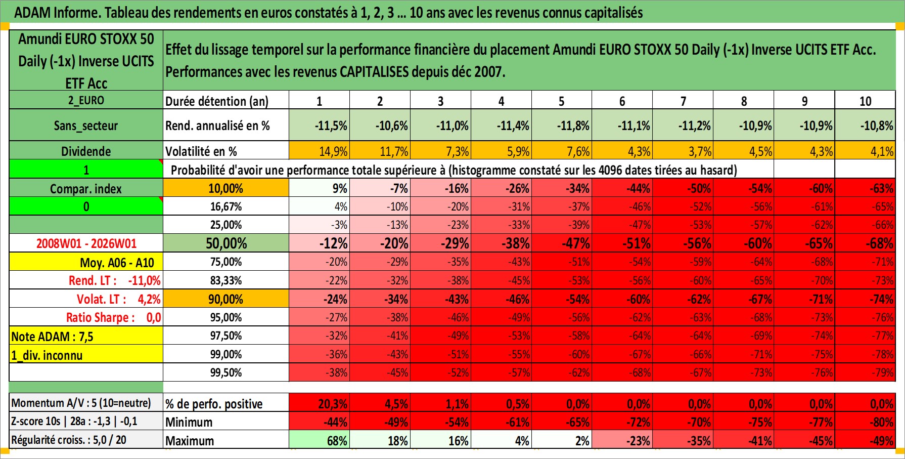 Site dédié aux investisseursPage dédiée sur site financeAnalyse des valorisations hebdomadaires du fonds Amundi EURO STOXX 50 Daily (-1x) Inverse UCITS ETF Acc. Cet actif est cote en EUR. Les valorisations couvrent les semaines 2008W01 a 2026W01. Les revenus de cet actif financier sont pris en compte depuis la semaine 2008W01. La note ESG de cet actif n'est pas connue.