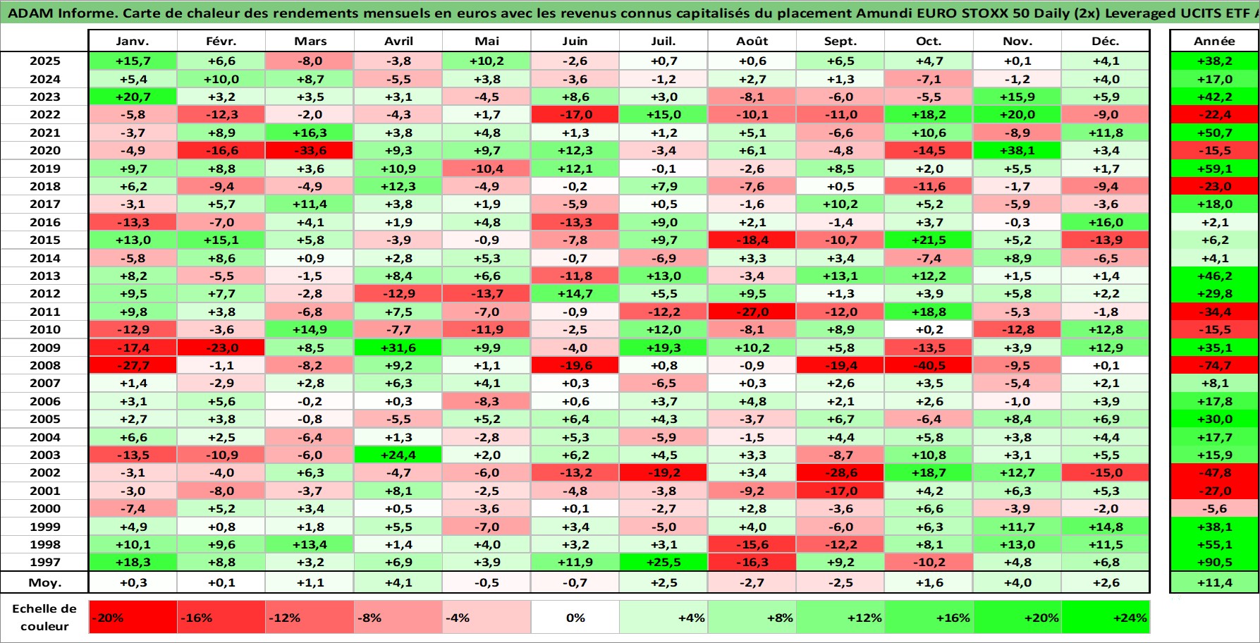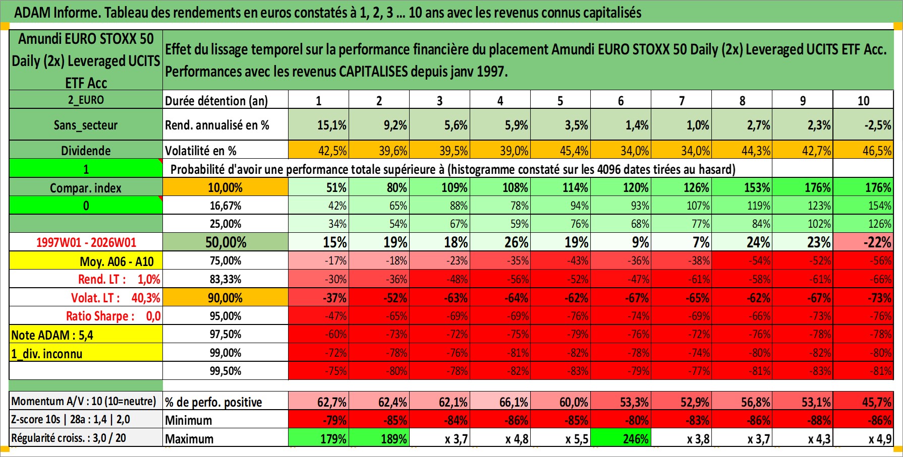 Site dédié aux investisseursPage dédiée sur site financeAnalyse des valorisations hebdomadaires du fonds Amundi EURO STOXX 50 Daily (2x) Leveraged UCITS ETF Acc. Cet actif est cote en EUR. Les valorisations couvrent les semaines 1997W01 a 2026W01. Les revenus de cet actif financier sont pris en compte depuis la semaine 1997W01. La note ESG de cet actif n'est pas connue.
