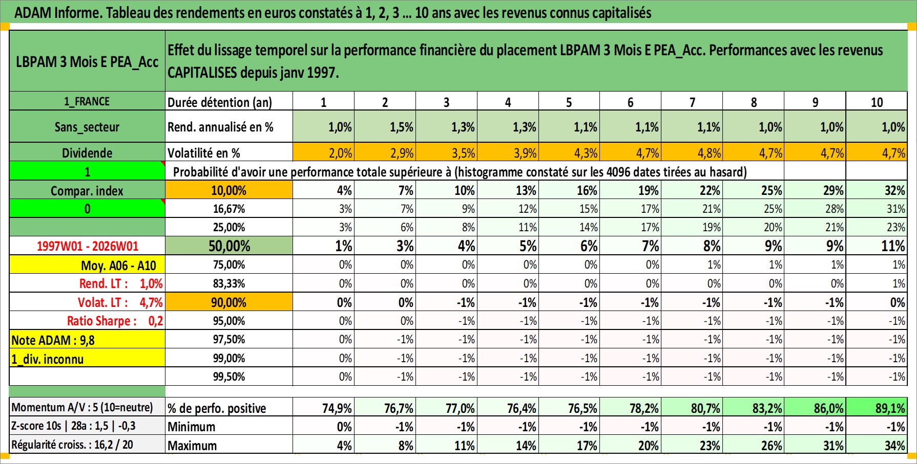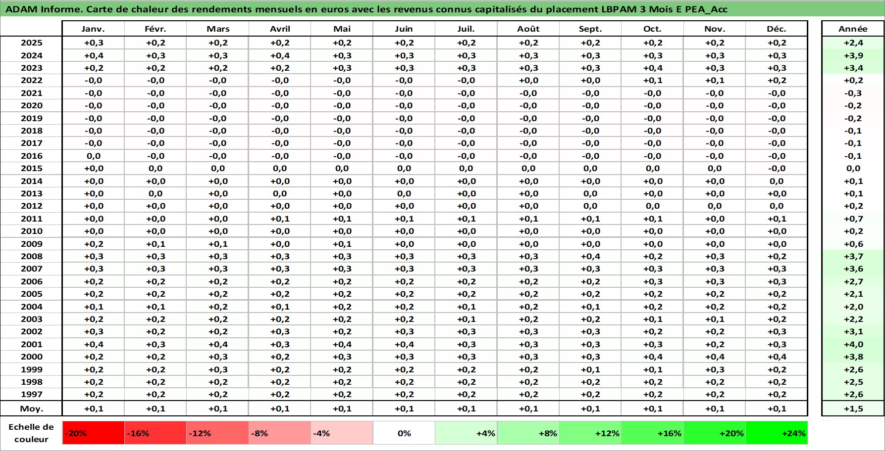 Site dédié aux investisseursPage dédiée sur site financeAnalyse des valorisations hebdomadaires du fonds LBPAM 3 Mois E PEA_Acc. Cet actif est cote en EUR. Les valorisations couvrent les semaines 1997W01 a 2026W01. Les revenus de cet actif financier sont pris en compte depuis la semaine 1997W01. La note ESG de cet actif n'est pas connue.