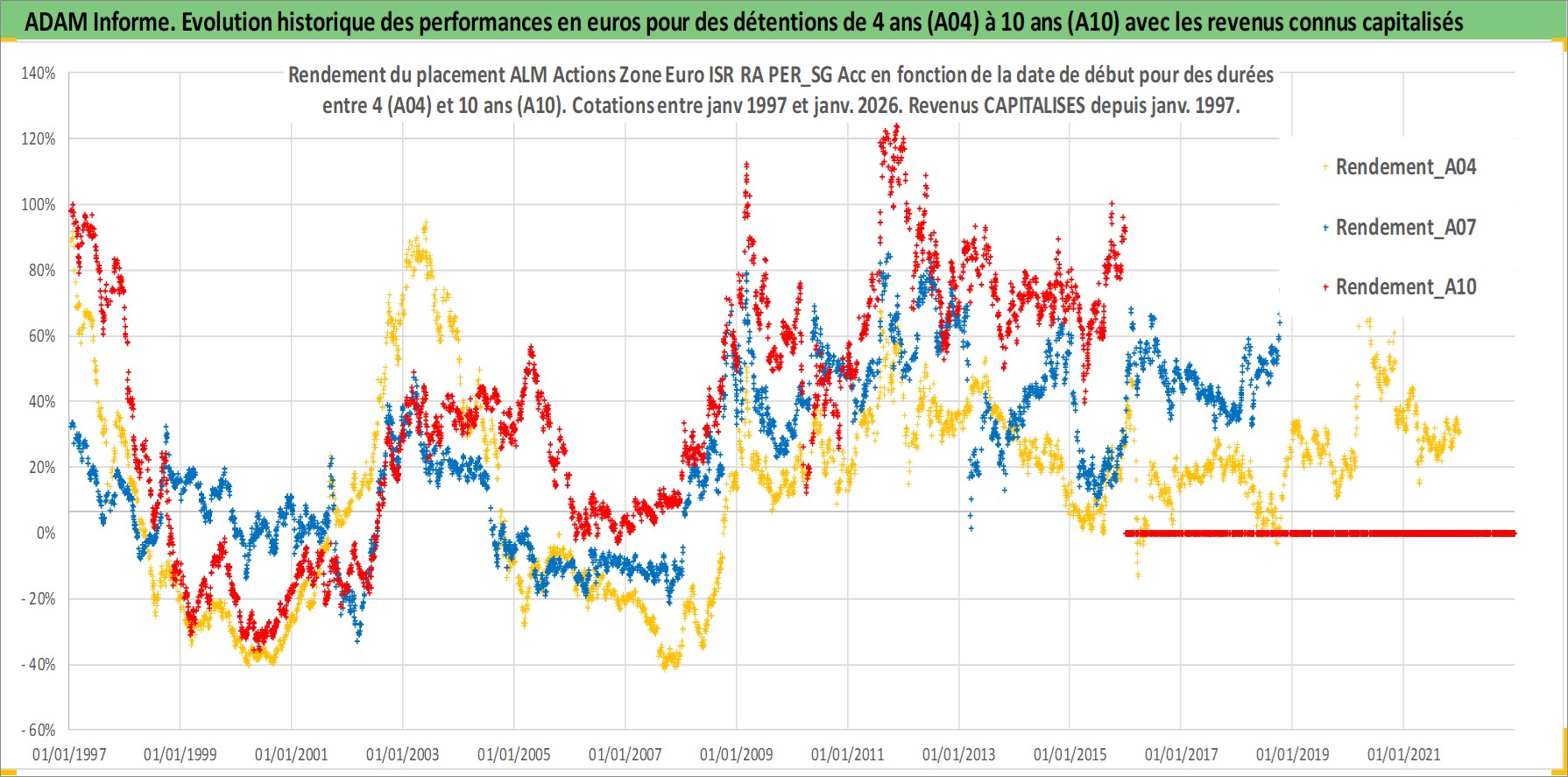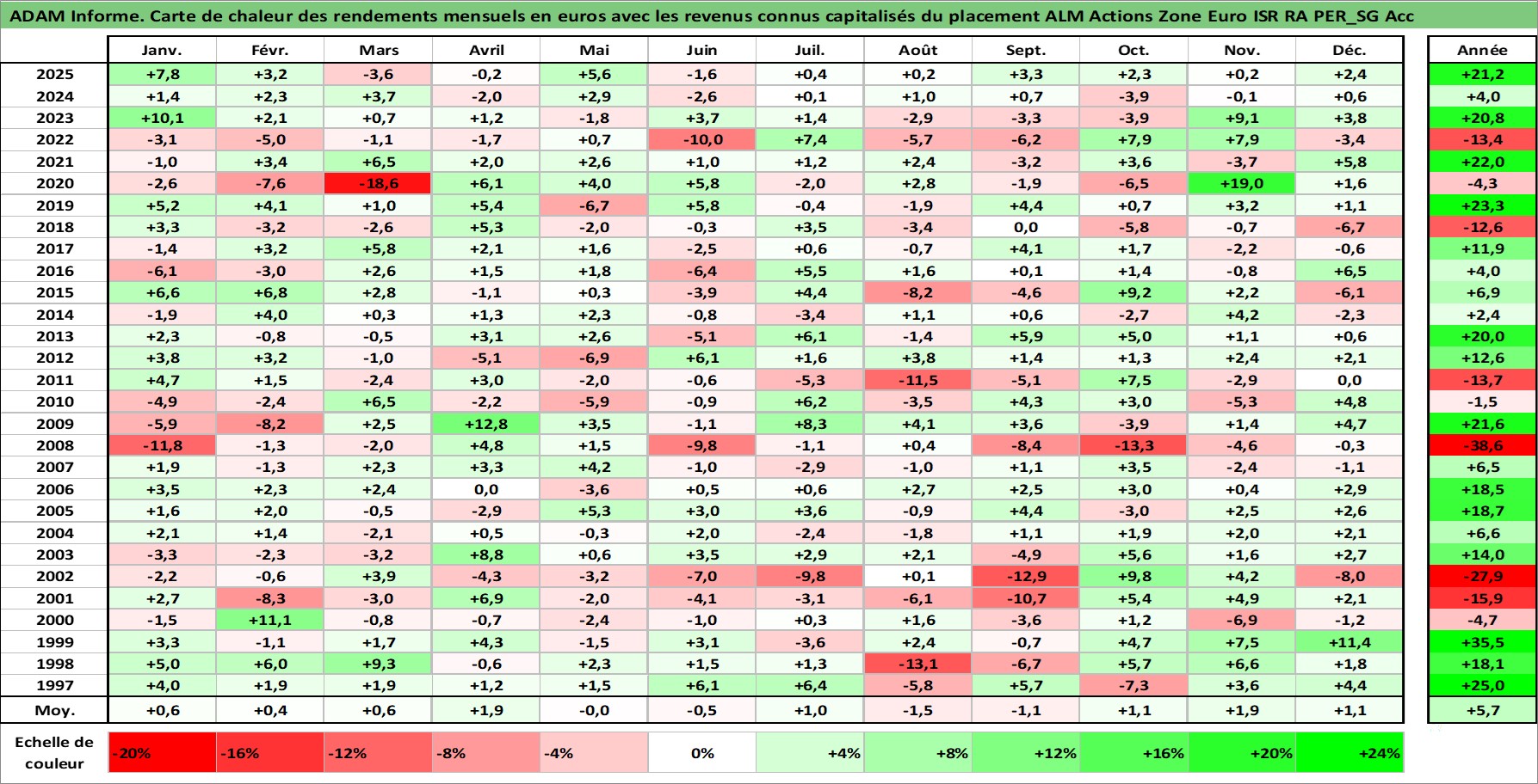 Site dédié aux investisseursPage dédiée sur site financeAnalyse des valorisations hebdomadaires du fonds ALM Actions Zone Euro ISR RA PER_SG Acc. Cet actif est cote en EUR. Les valorisations couvrent les semaines 1997W01 a 2026W01. Les revenus de cet actif financier sont pris en compte depuis la semaine 1997W01. La note globale ESG de cet actif est estimee a 10.0 (apres rebasage entre 0 et 20).