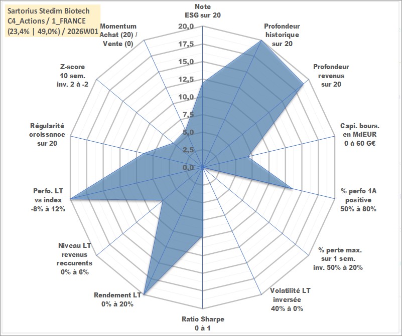 Site dédié aux investisseursPage dédiée sur site financeAnalyse des valorisations hebdomadaires de l'action Sartorius Stedim Biotech. Cet actif est cote en EUR. Les valorisations couvrent les semaines 1997W01 a 2026W01. Les revenus de cet actif financier sont pris en compte depuis la semaine 1998W28. La note globale ESG de cet actif est estimee a 12.0 (apres rebasage entre 0 et 20).