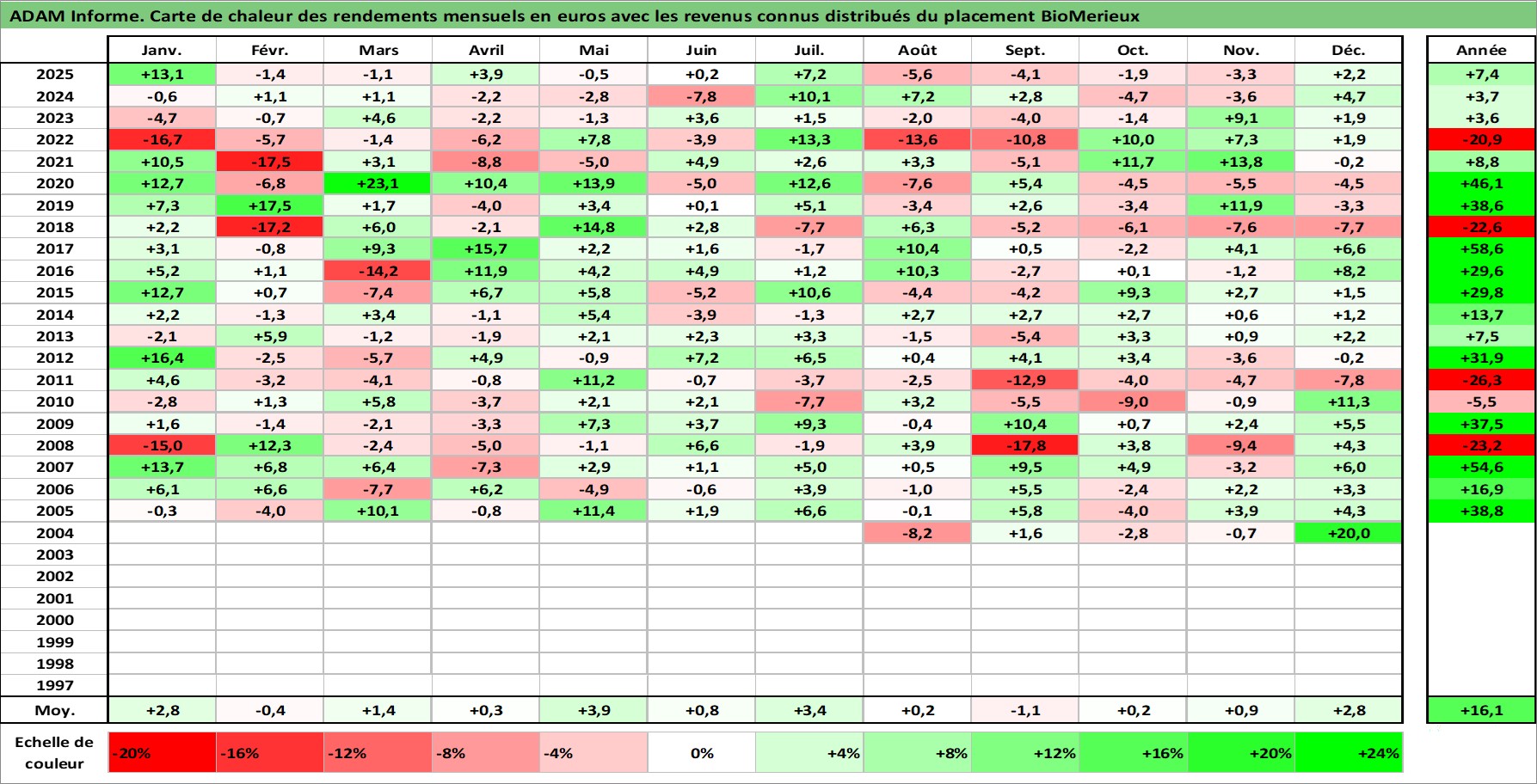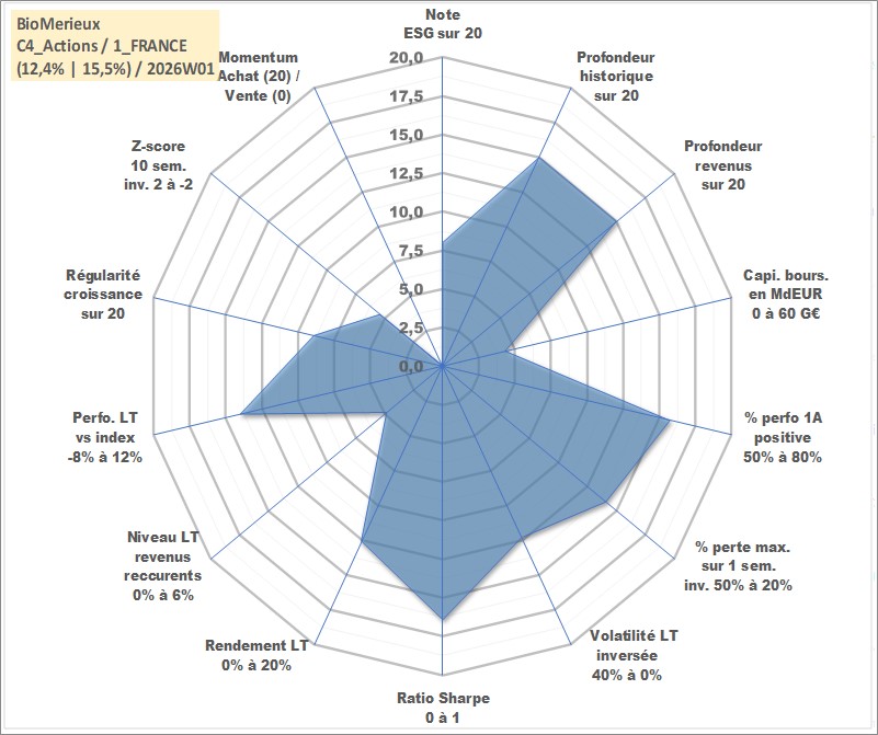 Site dédié aux investisseursPage dédiée sur site financeAnalyse des valorisations hebdomadaires de l'action BioMerieux. Cet actif est cote en EUR. Les valorisations couvrent les semaines 2004W28 a 2026W01. Les revenus de cet actif financier sont pris en compte depuis la semaine 2005W25. La note globale ESG de cet actif est estimee a 8.0 (apres rebasage entre 0 et 20).