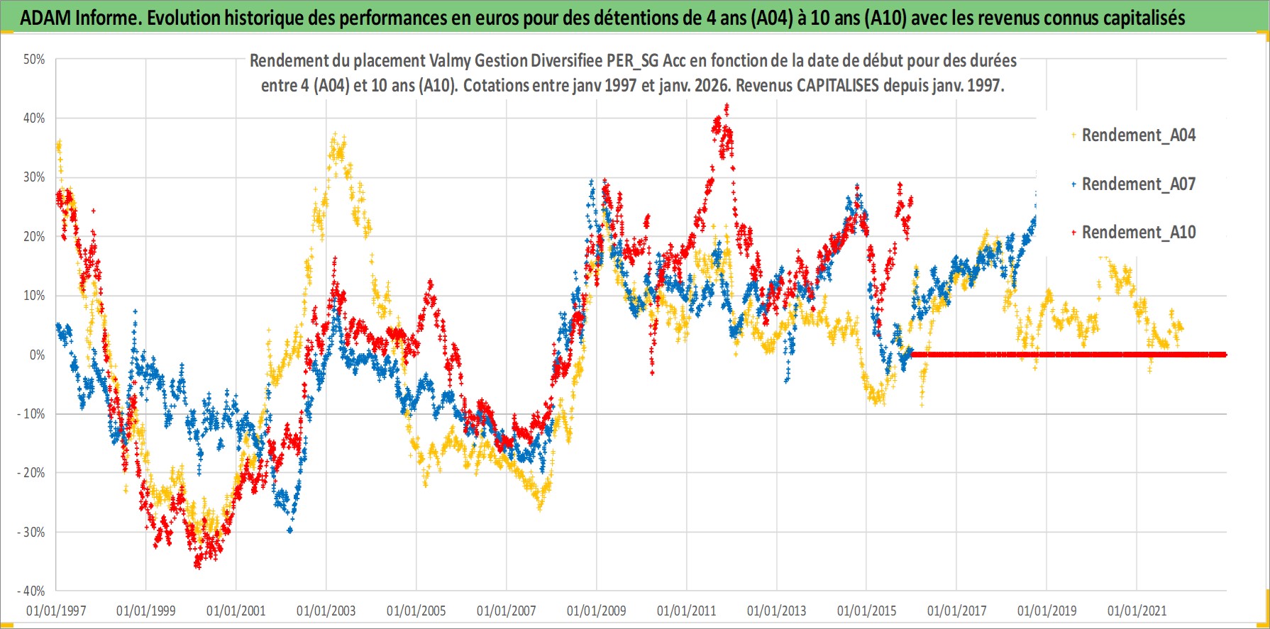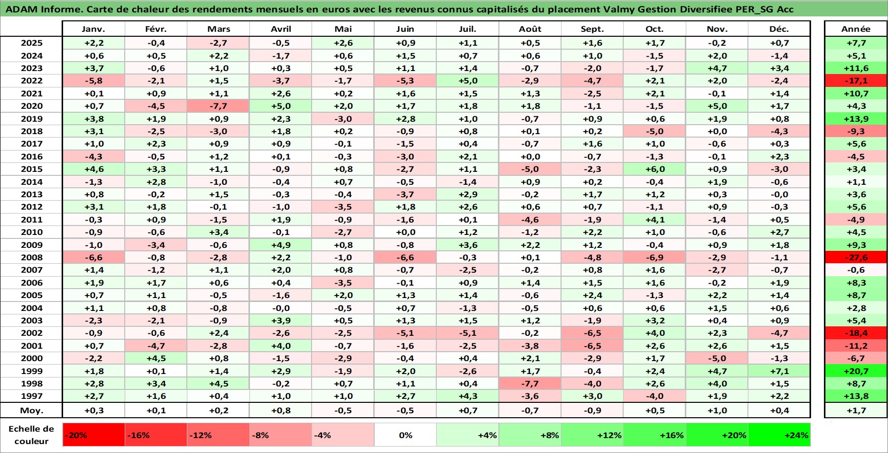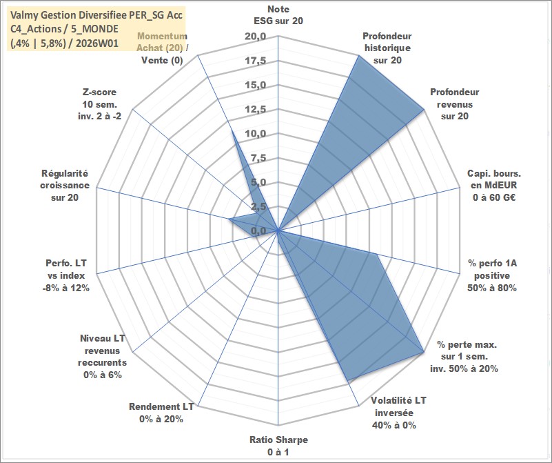Site dédié aux investisseursPage dédiée sur site financeAnalyse des valorisations hebdomadaires du fonds Valmy Gestion Diversifiee PER_SG Acc. Cet actif est cote en EUR. Les valorisations couvrent les semaines 1997W01 a 2026W01. Les revenus de cet actif financier sont pris en compte depuis la semaine 1997W01. La note ESG de cet actif n'est pas connue.