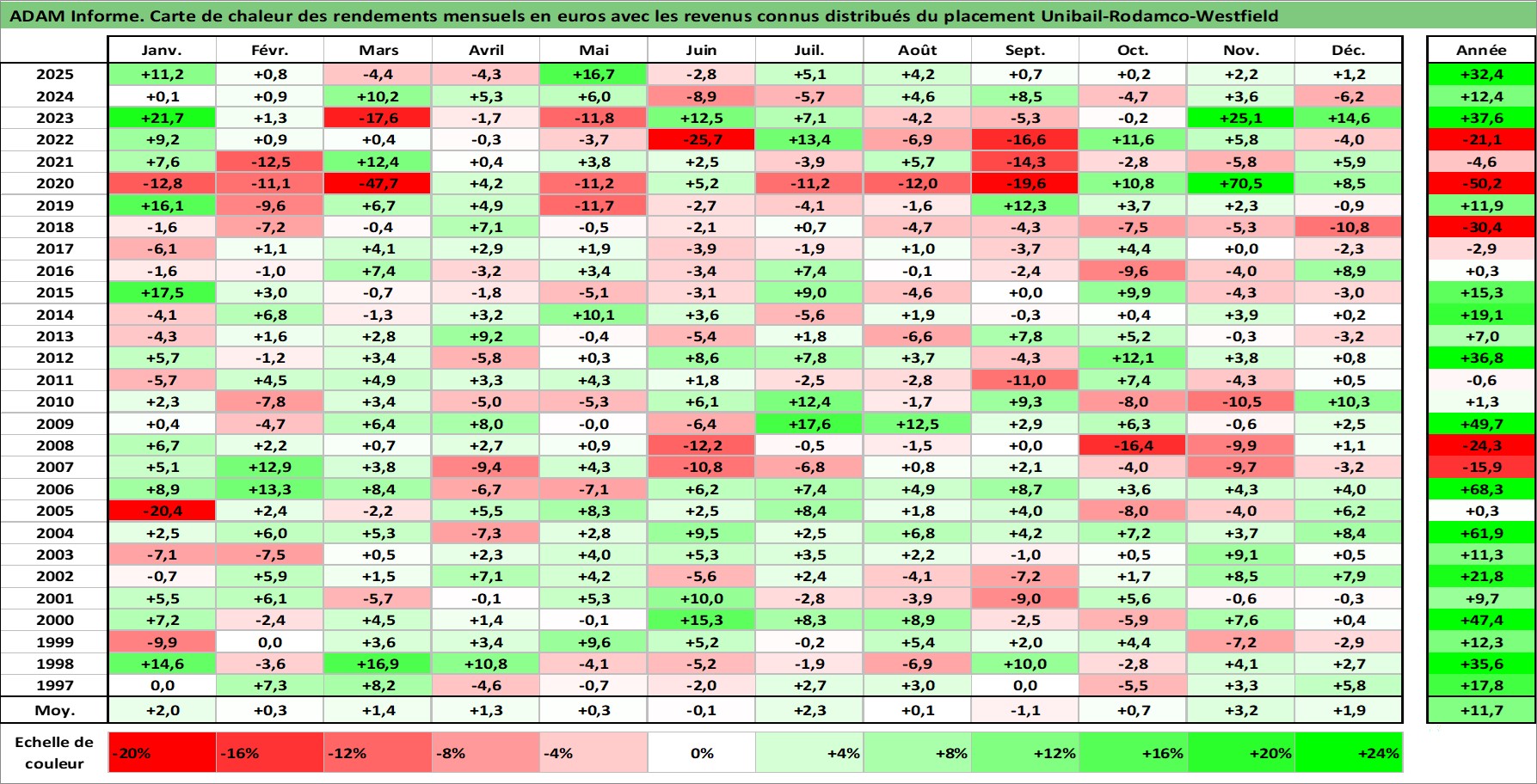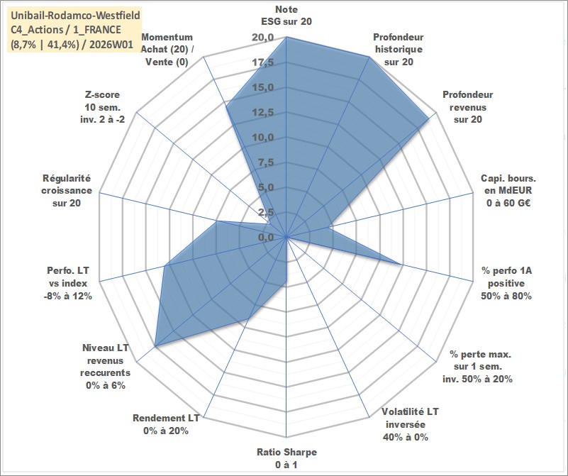 Site dédié aux investisseursPage dédiée sur site financeAnalyse des valorisations hebdomadaires de l'action Unibail-Rodamco-Westfield. Cet actif est cote en EUR. Les valorisations couvrent les semaines 1997W01 a 2026W01. Les revenus de cet actif financier sont pris en compte depuis la semaine 1999W23. La note globale ESG de cet actif est estimee a 20.0 (apres rebasage entre 0 et 20).