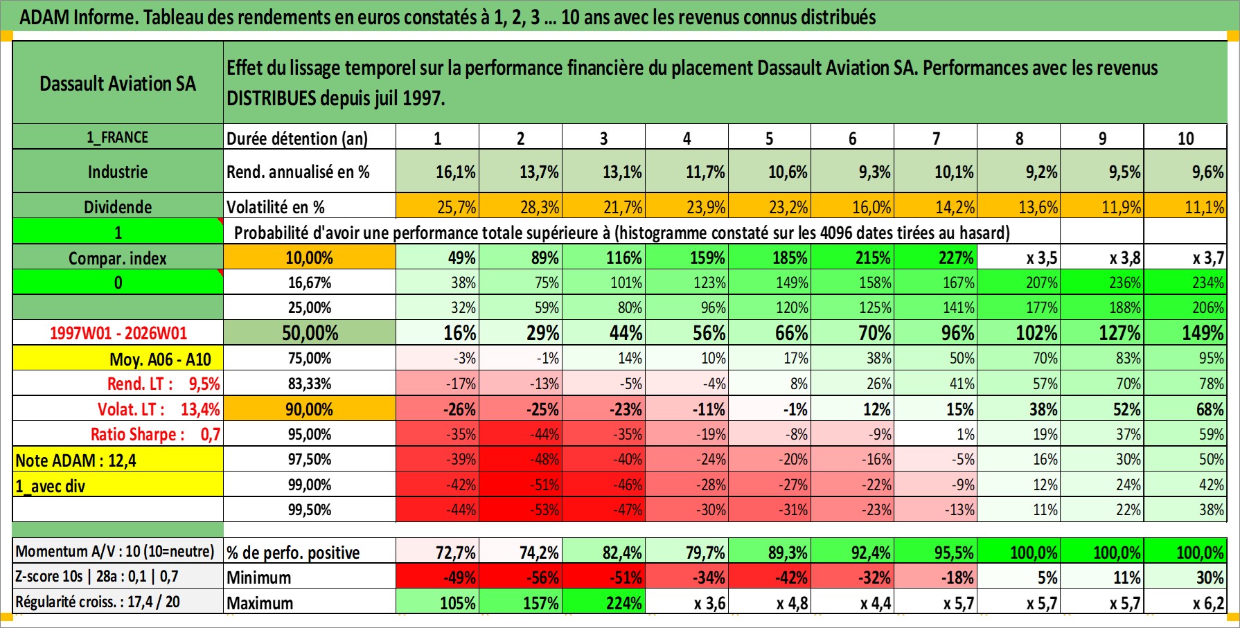 Site dédié aux investisseursPage dédiée sur site financeAnalyse des valorisations hebdomadaires de l'action Dassault Aviation SA. Cet actif est cote en EUR. Les valorisations couvrent les semaines 1997W01 a 2026W01. Les revenus de cet actif financier sont pris en compte depuis la semaine 1997W27. La note ESG de cet actif n'est pas connue.