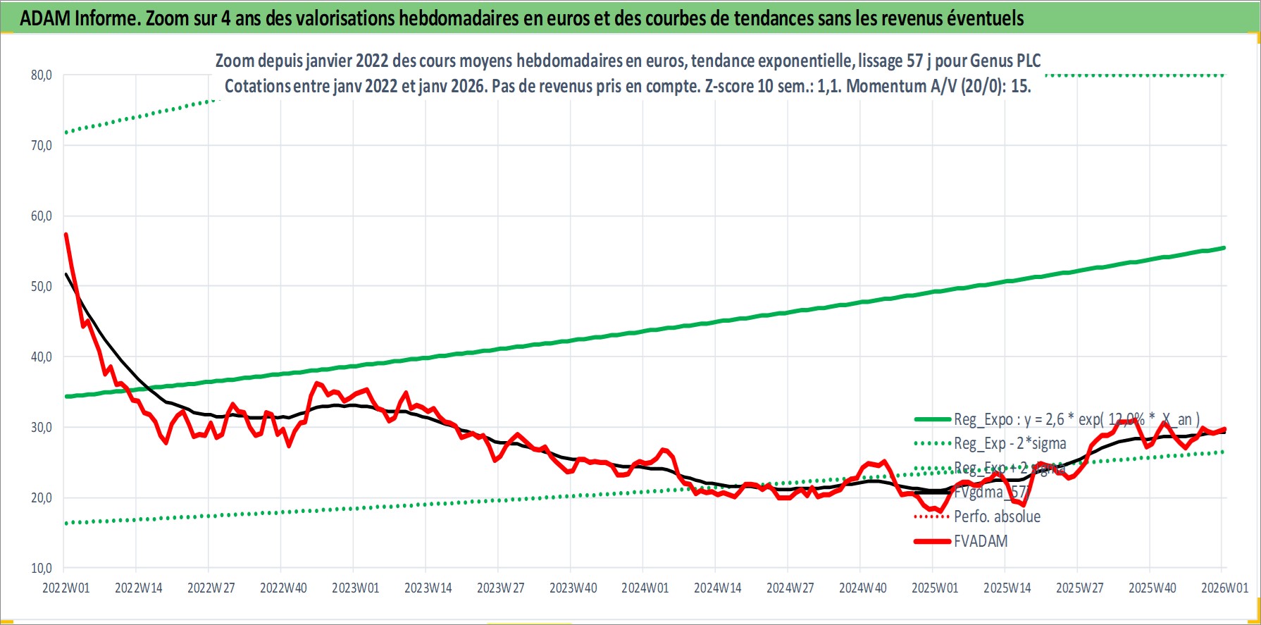 Site dédié aux investisseursPage dédiée sur site financeAnalyse des valorisations hebdomadaires de l'action Genus PLC. Cet actif est cote en GBX. Les valorisations sont en contrevaleur EURO et couvrent les semaines 2000W27 a 2026W01. Les revenus de cet actif financier sont pris en compte depuis la semaine 2000W32. La note ESG de cet actif n'est pas connue.