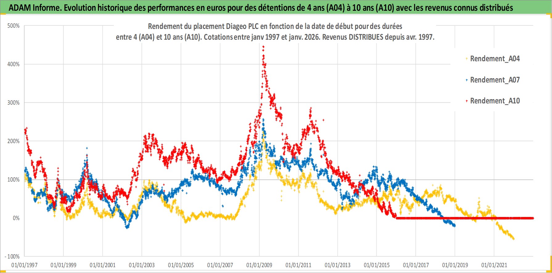 Site dédié aux investisseursPage dédiée sur site financeAnalyse des valorisations hebdomadaires de l'action Diageo PLC. Cet actif est cote en GBX. Les valorisations sont en contrevaleur EURO et couvrent les semaines 1997W01 a 2026W01. Les revenus de cet actif financier sont pris en compte depuis la semaine 1997W14. La note globale ESG de cet actif est estimee a 12.0 (apres rebasage entre 0 et 20).