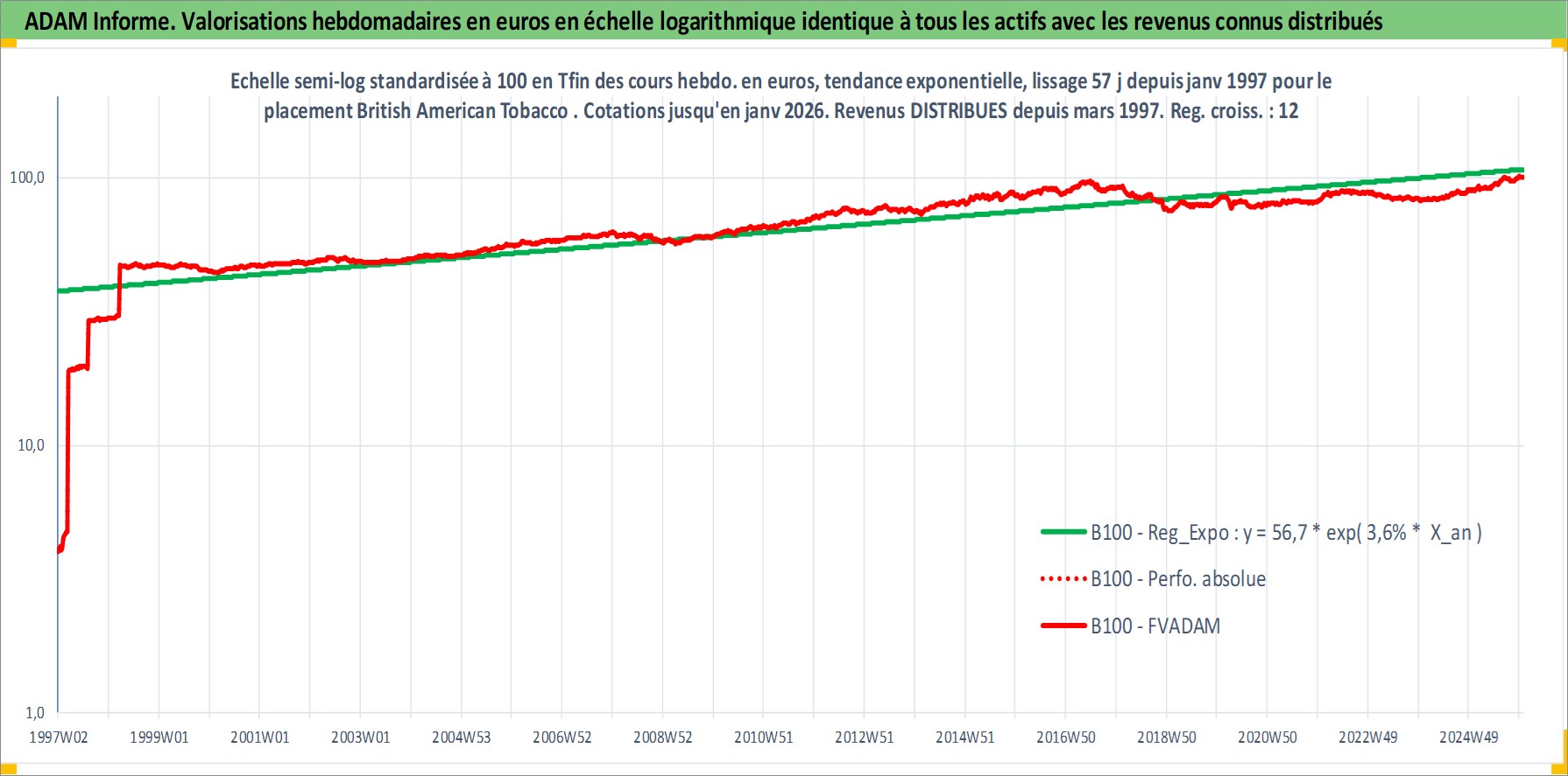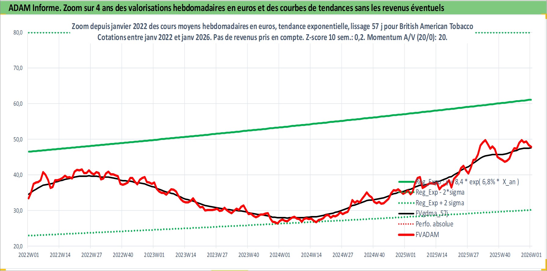 Site dédié aux investisseursPage dédiée sur site financeAnalyse des valorisations hebdomadaires de l'action British American Tobacco PLC. Cet actif est cote en GBX. Les valorisations sont en contrevaleur EURO et couvrent les semaines 1997W01 a 2026W01. Les revenus de cet actif financier sont pris en compte depuis la semaine 1997W12. La note globale ESG de cet actif est estimee a 7.0 (apres rebasage entre 0 et 20).