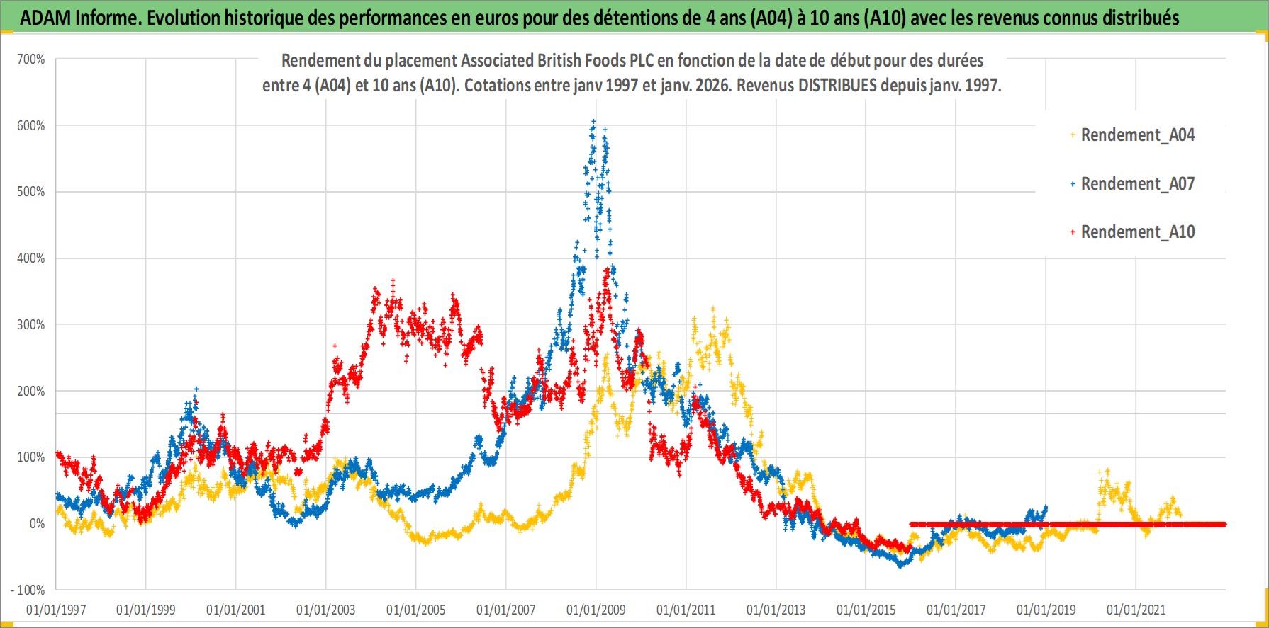 Site dédié aux investisseursPage dédiée sur site financeAnalyse des valorisations hebdomadaires de l'action Associated British Foods PLC. Cet actif est cote en GBX. Les valorisations sont en contrevaleur EURO et couvrent les semaines 1997W01 a 2026W01. Les revenus de cet actif financier sont pris en compte depuis la semaine 1997W05. La note globale ESG de cet actif est estimee a 7.0 (apres rebasage entre 0 et 20).