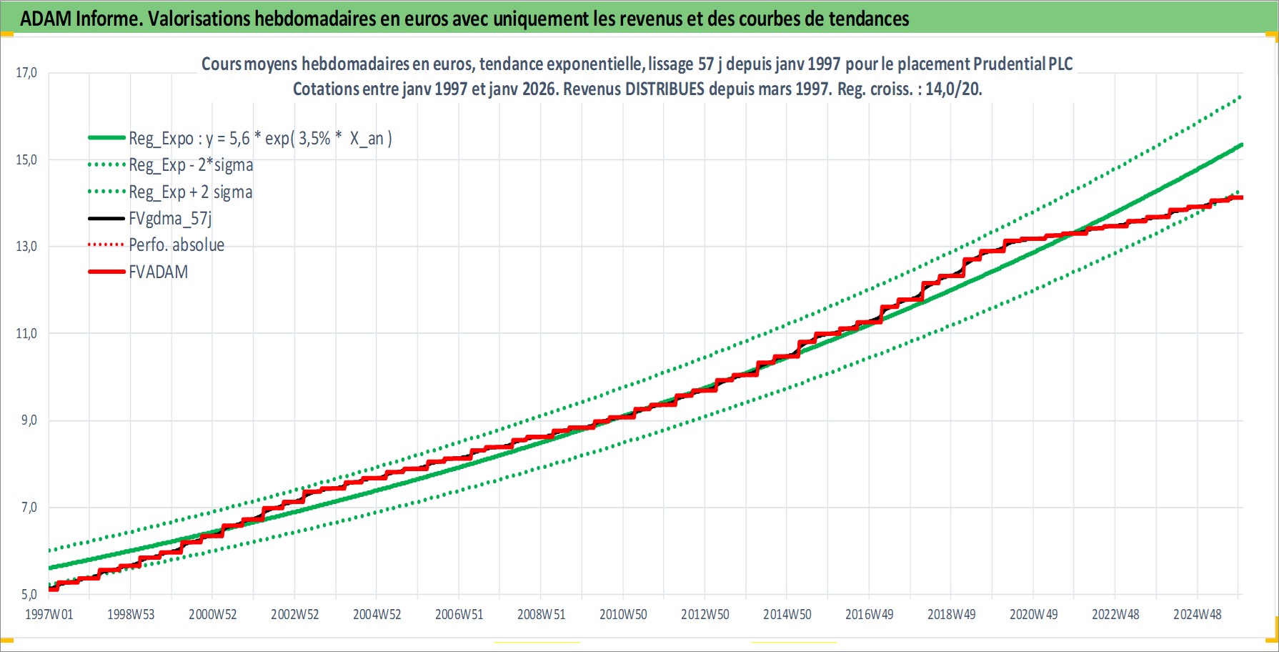 Site dédié aux investisseursPage dédiée sur site financeAnalyse des valorisations hebdomadaires de l'action Prudential PLC. Cet actif est cote en GBX. Les valorisations sont en contrevaleur EURO et couvrent les semaines 1997W01 a 2026W01. Les revenus de cet actif financier sont pris en compte depuis la semaine 1997W13. La note globale ESG de cet actif est estimee a 13.0 (apres rebasage entre 0 et 20).