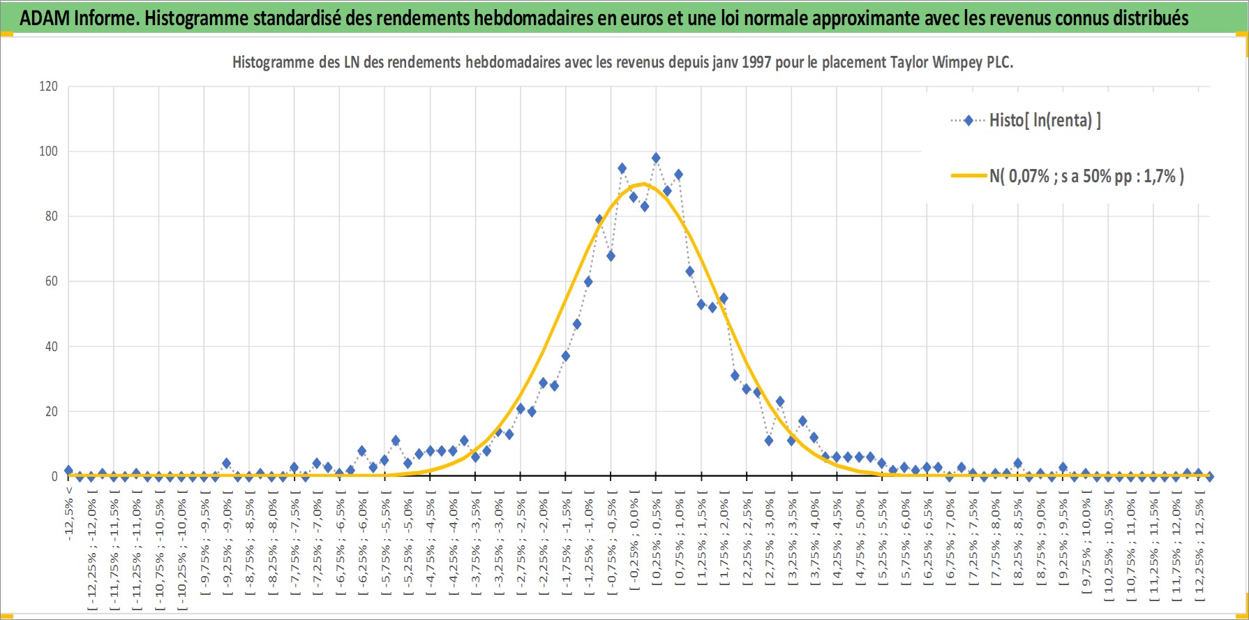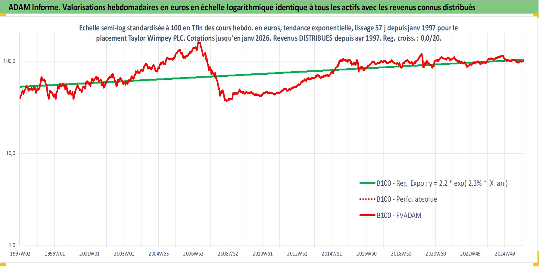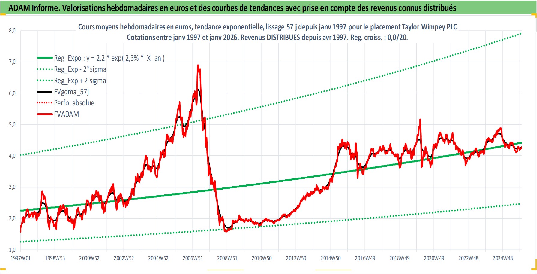 Site dédié aux investisseursPage dédiée sur site financeAnalyse des valorisations hebdomadaires de l'action Taylor Wimpey PLC. Cet actif est cote en GBX. Les valorisations sont en contrevaleur EURO et couvrent les semaines 1997W01 a 2026W01. Les revenus de cet actif financier sont pris en compte depuis la semaine 1997W15. La note globale ESG de cet actif est estimee a 15.0 (apres rebasage entre 0 et 20).