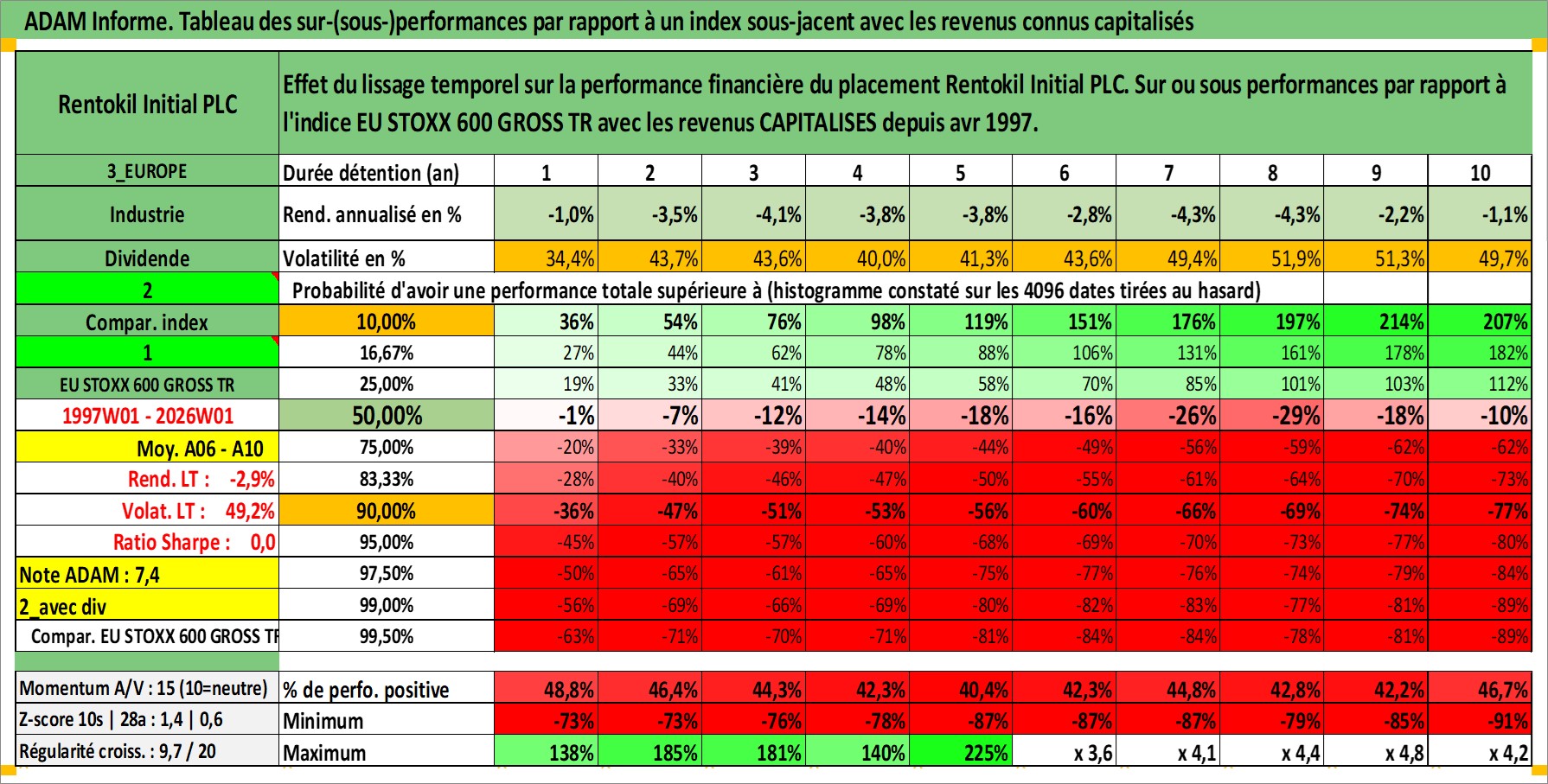 Site dédié aux investisseursPage dédiée sur site financeAnalyse des valorisations hebdomadaires de l'action Rentokil Initial PLC. Cet actif est cote en GBX. Les valorisations sont en contrevaleur EURO et couvrent les semaines 1997W01 a 2026W01. Les revenus de cet actif financier sont pris en compte depuis la semaine 1997W16. La note globale ESG de cet actif est estimee a 13.0 (apres rebasage entre 0 et 20).