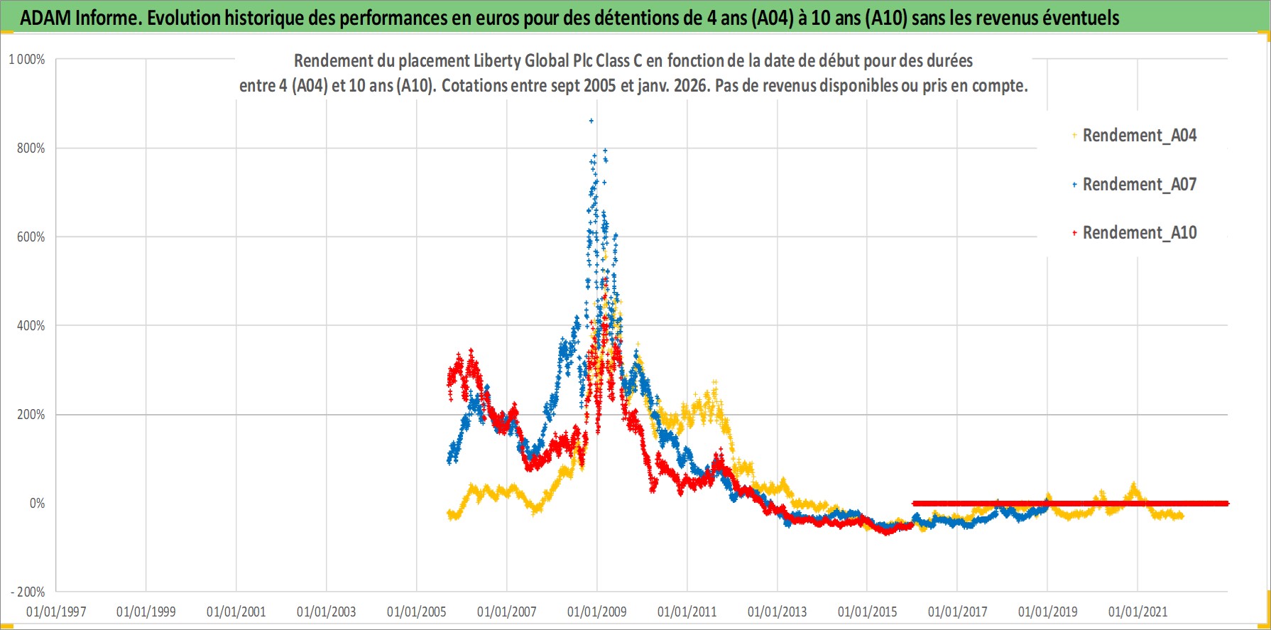 Site dédié aux investisseursPage dédiée sur site financeAnalyse des valorisations hebdomadaires de l'action Liberty Global Plc Class C. Cet actif est cote en USD. Les valorisations sont en contrevaleur EURO et couvrent les semaines 2005W36 a 2026W01. Les revenus de cet actif financier ne sont pas connus car non existants ou non disponibles sur le site Yahoo Finance. La note ESG de cet actif n'est pas connue.