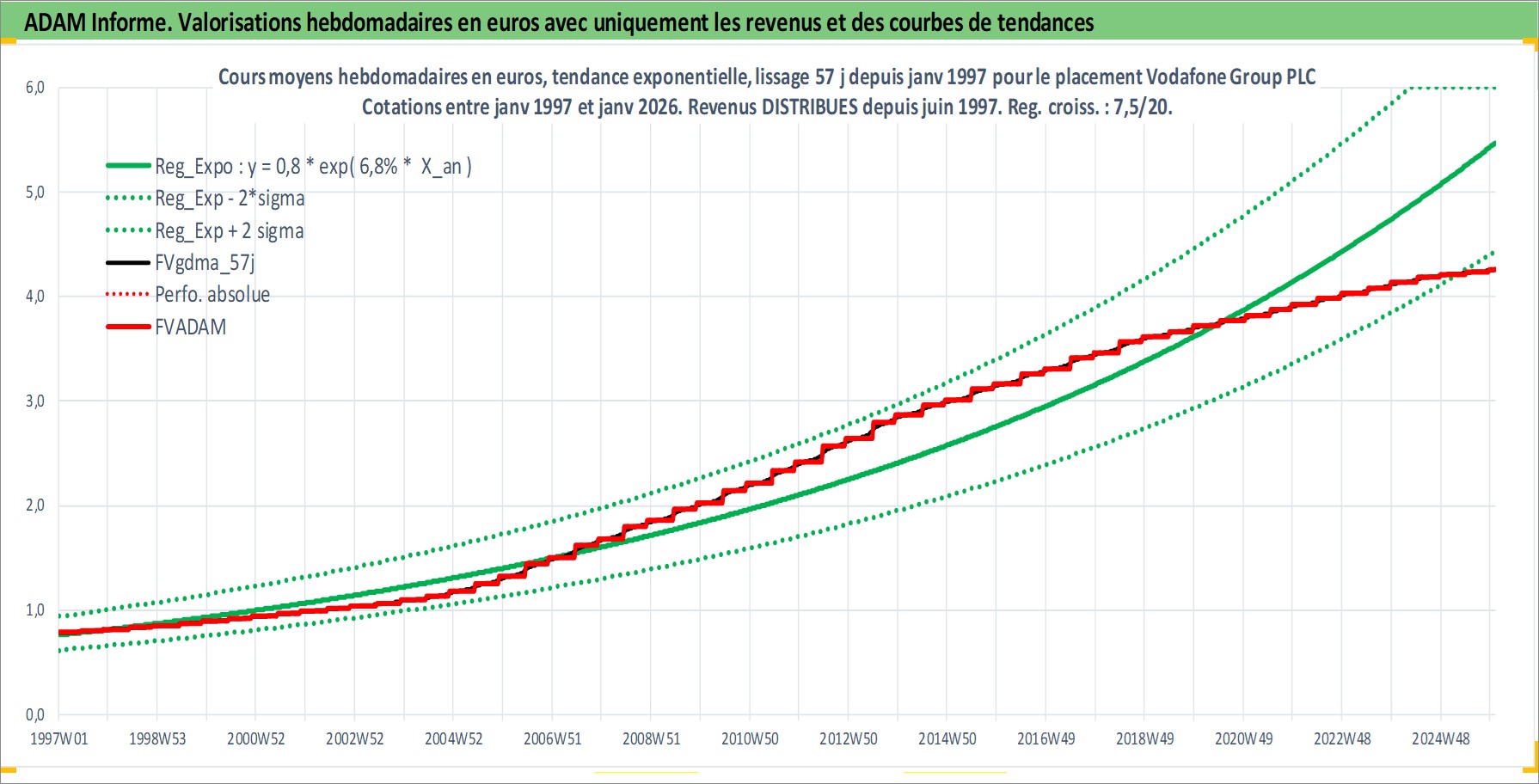 Site dédié aux investisseursPage dédiée sur site financeAnalyse des valorisations hebdomadaires de l'action Vodafone Group PLC. Cet actif est cote en GBX. Les valorisations sont en contrevaleur EURO et couvrent les semaines 1997W01 a 2026W01. Les revenus de cet actif financier sont pris en compte depuis la semaine 1997W24. La note globale ESG de cet actif est estimee a 13.0 (apres rebasage entre 0 et 20).