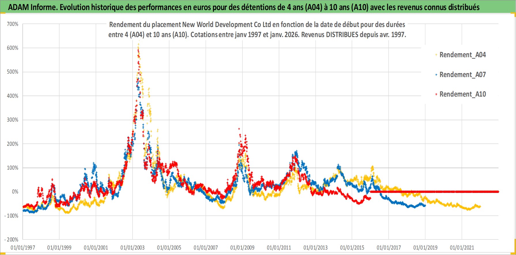 Site dédié aux investisseursPage dédiée sur site financeAnalyse des valorisations hebdomadaires de l'action New World Development Co Ltd. Cet actif est cote en HKD. Les valorisations sont en contrevaleur EURO et couvrent les semaines 1997W01 a 2026W01. Les revenus de cet actif financier sont pris en compte depuis la semaine 1997W15. La note globale ESG de cet actif est estimee a 14.0 (apres rebasage entre 0 et 20).