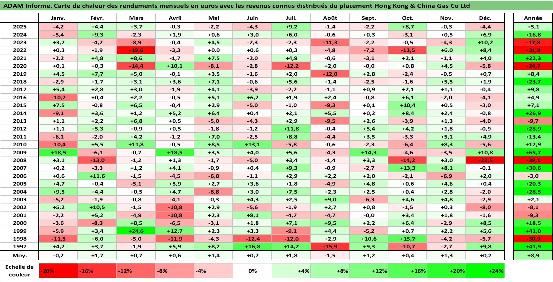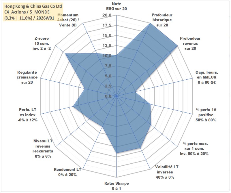 Site dédié aux investisseursPage dédiée sur site financeAnalyse des valorisations hebdomadaires de l'action Hong Kong & China Gas Co Ltd. Cet actif est cote en HKD. Les valorisations sont en contrevaleur EURO et couvrent les semaines 1997W01 a 2026W01. Les revenus de cet actif financier sont pris en compte depuis la semaine 1997W16. La note globale ESG de cet actif est estimee a 10.0 (apres rebasage entre 0 et 20).
