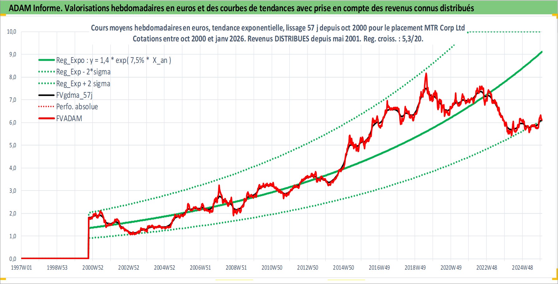 Site dédié aux investisseursPage dédiée sur site financeAnalyse des valorisations hebdomadaires de l'action MTR Corp Ltd. Cet actif est cote en HKD. Les valorisations sont en contrevaleur EURO et couvrent les semaines 2000W40 a 2026W01. Les revenus de cet actif financier sont pris en compte depuis la semaine 2001W19. La note globale ESG de cet actif est estimee a 9.0 (apres rebasage entre 0 et 20).