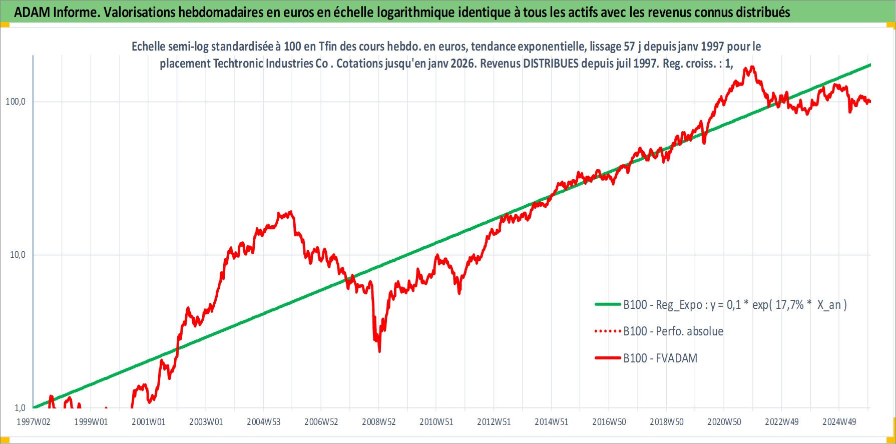 Site dédié aux investisseursPage dédiée sur site financeAnalyse des valorisations hebdomadaires de l'action Techtronic Industries Co Ltd. Cet actif est cote en HKD. Les valorisations sont en contrevaleur EURO et couvrent les semaines 1997W01 a 2026W01. Les revenus de cet actif financier sont pris en compte depuis la semaine 1997W28. La note globale ESG de cet actif est estimee a 9.0 (apres rebasage entre 0 et 20).