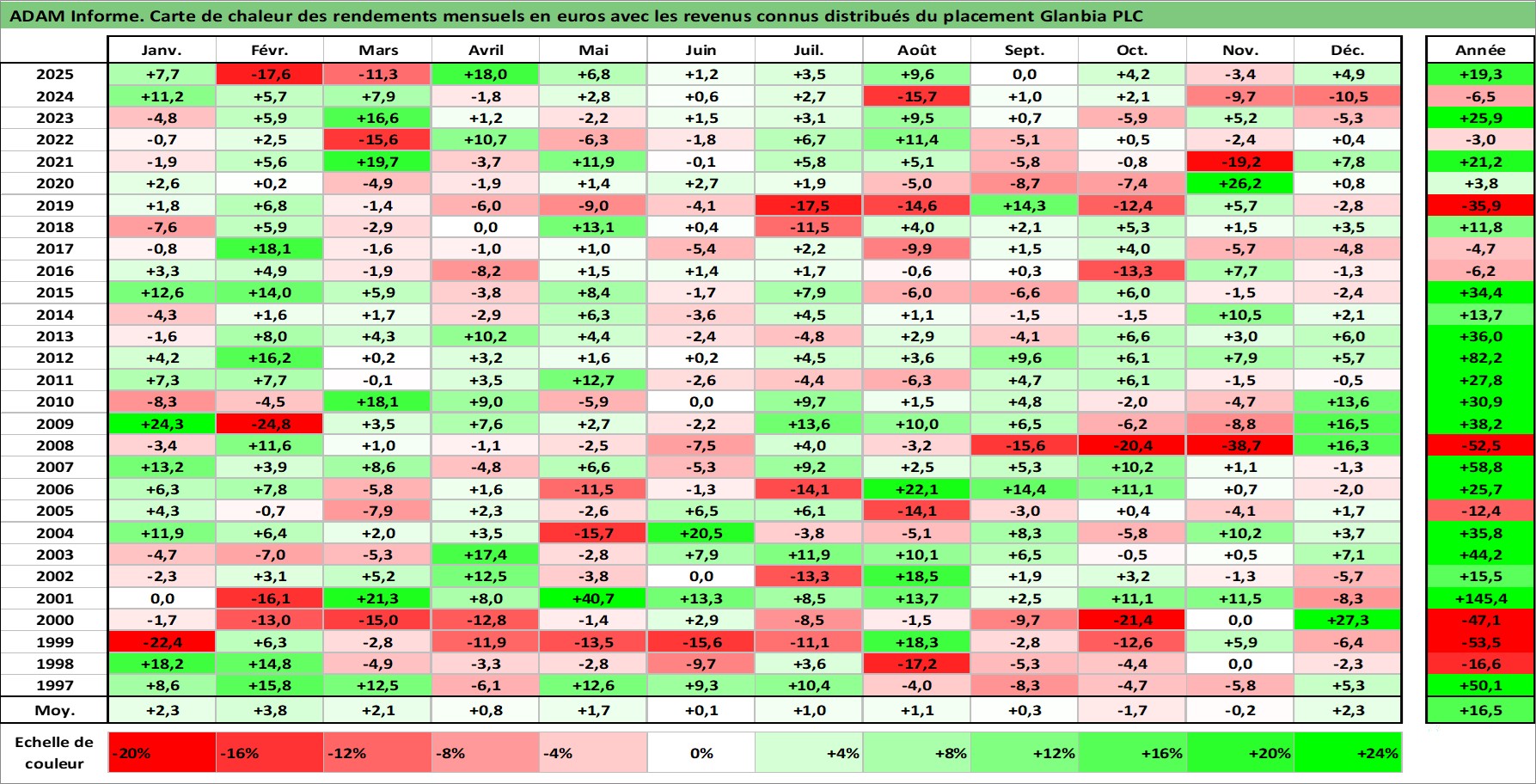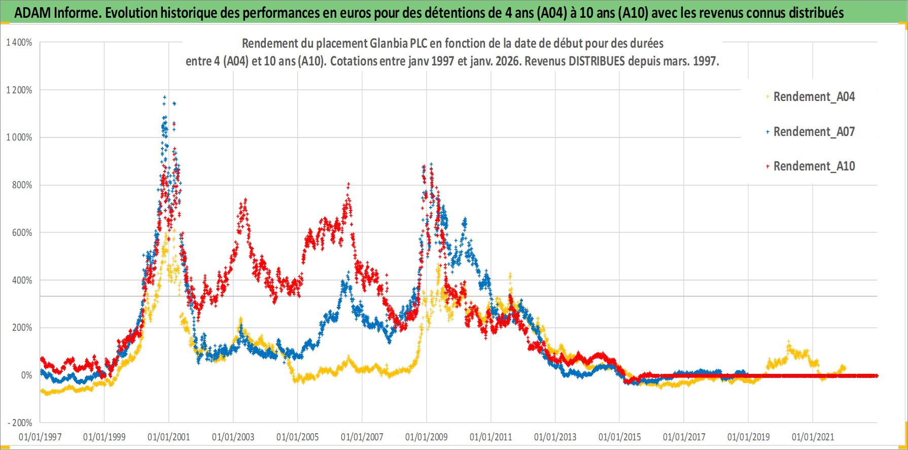 Site dédié aux investisseursPage dédiée sur site financeAnalyse des valorisations hebdomadaires de l'action Glanbia PLC. Cet actif est cote en EUR. Les valorisations couvrent les semaines 1997W01 a 2026W01. Les revenus de cet actif financier sont pris en compte depuis la semaine 1997W11. La note globale ESG de cet actif est estimee a 3.0 (apres rebasage entre 0 et 20).