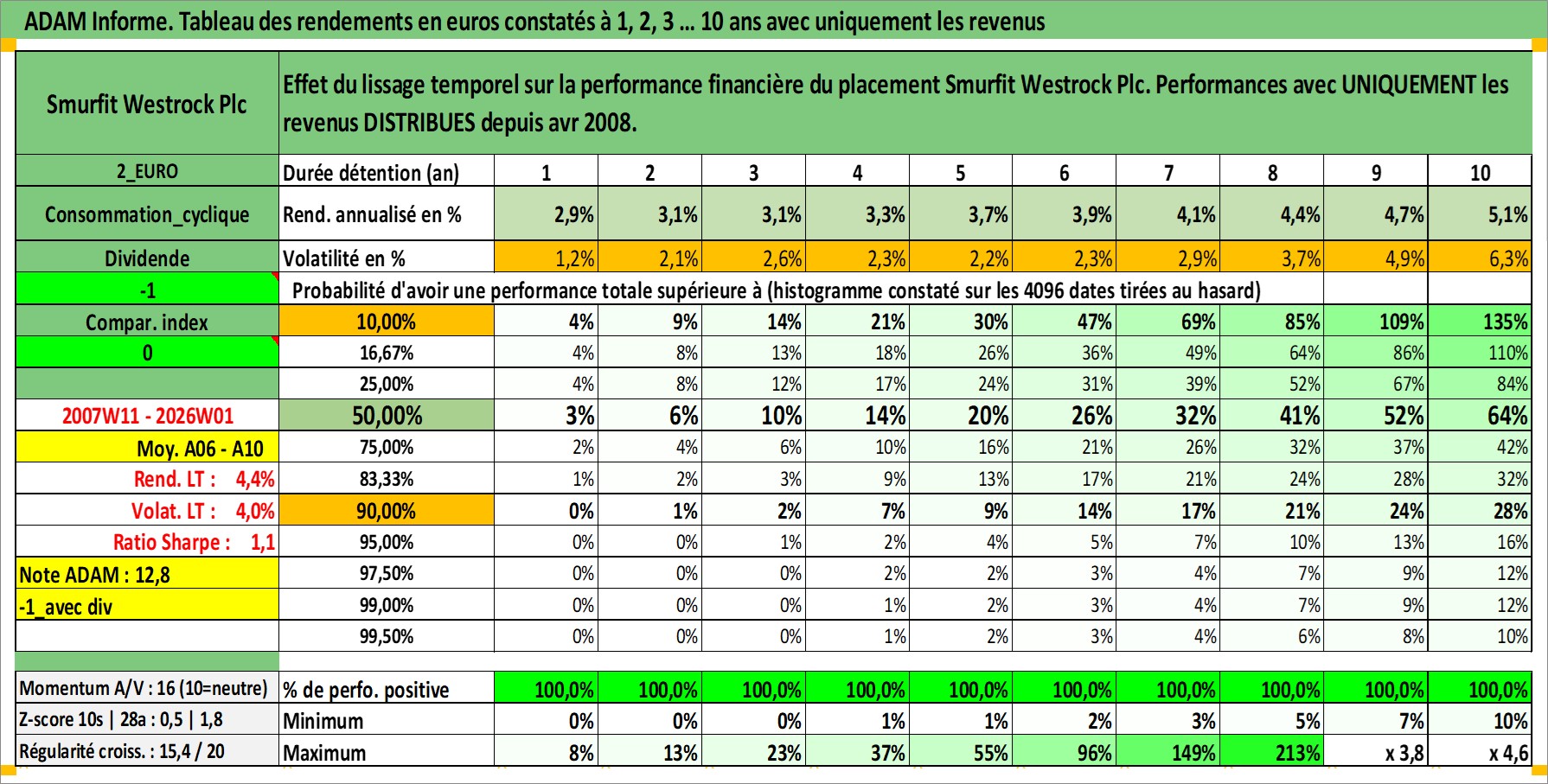 Site dédié aux investisseursPage dédiée sur site financeAnalyse des valorisations hebdomadaires de l'action Smurfit Westrock Plc. Cet actif est cote en GBX. Les valorisations sont en contrevaleur EURO et couvrent les semaines 2007W11 a 2026W01. Les revenus de cet actif financier sont pris en compte depuis la semaine 2008W14. La note globale ESG de cet actif est estimee a 16.0 (apres rebasage entre 0 et 20).