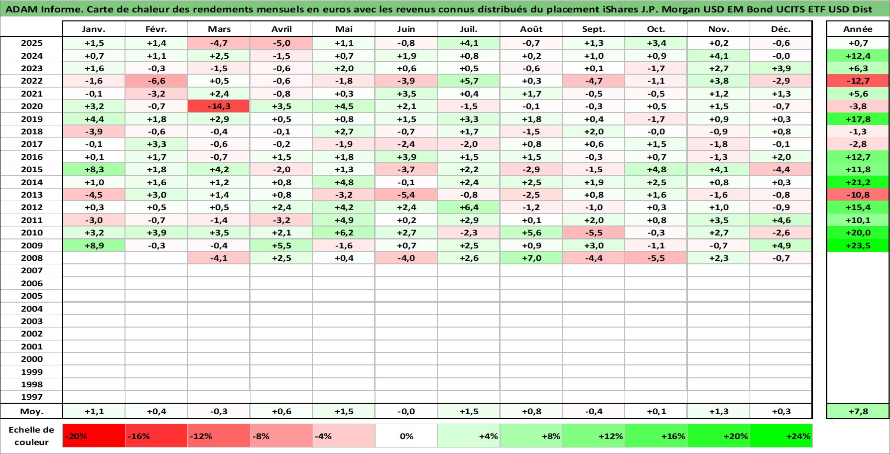 Site dédié aux investisseursPage dédiée sur site financeAnalyse des valorisations hebdomadaires du fonds iShares J.P. Morgan USD EM Bond UCITS ETF USD Dist. Cet actif est cote en USD. Les valorisations sont en contrevaleur EURO et couvrent les semaines 2008W07 a 2026W01. Les revenus de cet actif financier sont pris en compte depuis la semaine 2008W13. La note ESG de cet actif n'est pas connue.