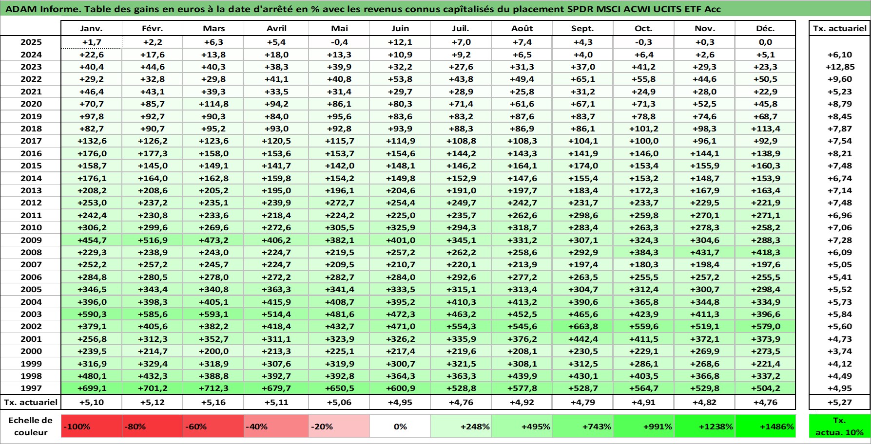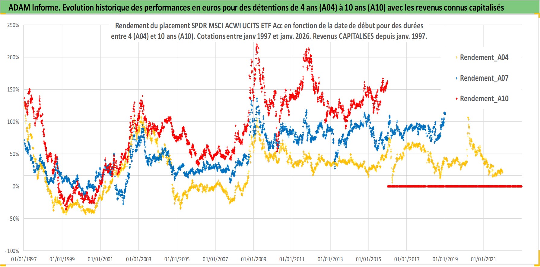 Site dédié aux investisseursPage dédiée sur site financeAnalyse des valorisations hebdomadaires du fonds SPDR MSCI ACWI UCITS ETF Acc. Cet actif est cote en EUR. Les valorisations couvrent les semaines 1997W01 a 2026W01. Les revenus de cet actif financier sont pris en compte depuis la semaine 1997W01. La note ESG de cet actif n'est pas connue.