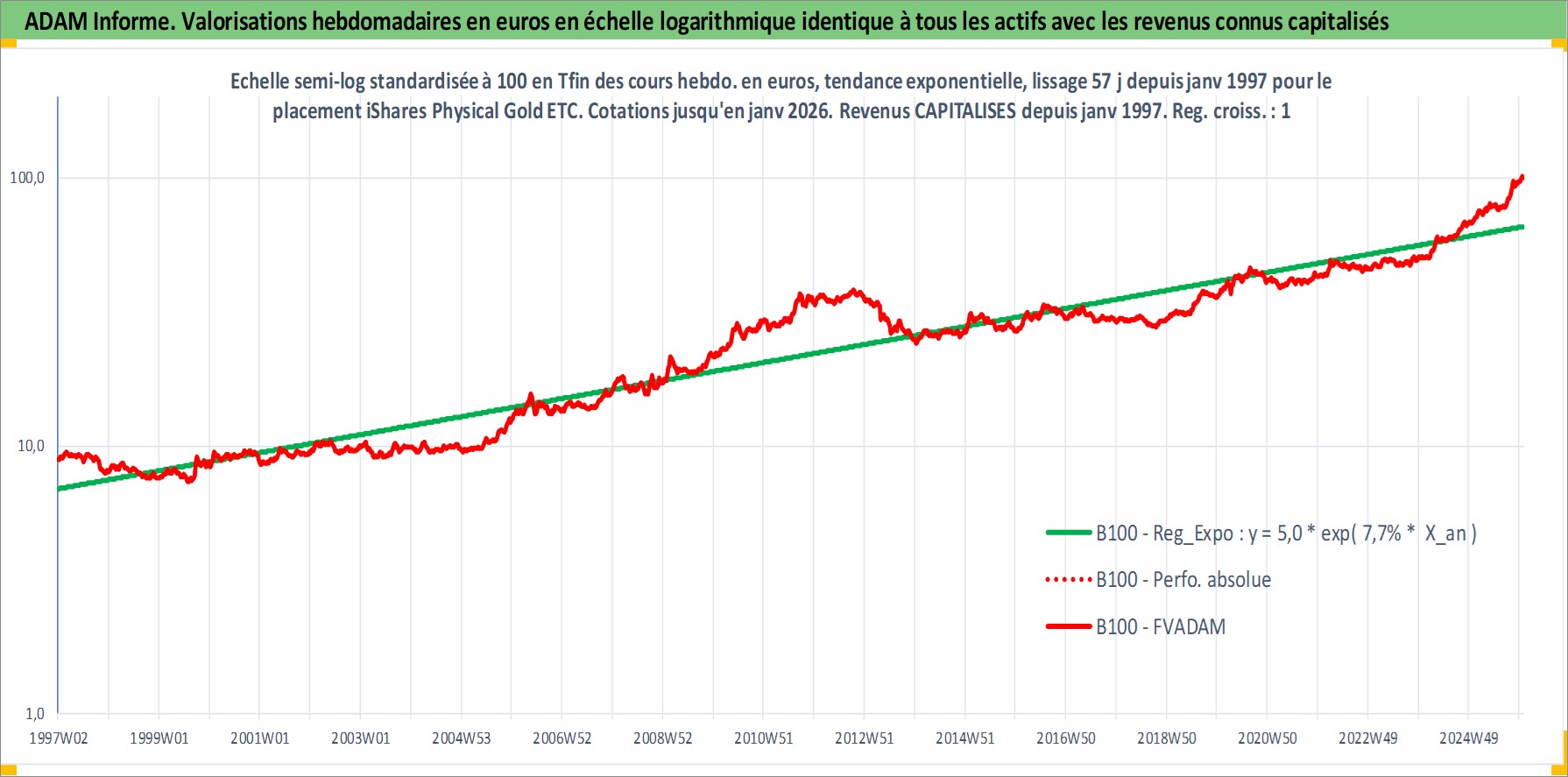 Site dédié aux investisseursPage dédiée sur site financeAnalyse des valorisations hebdomadaires du fonds iShares Physical Gold ETC Acc. Cet actif est cote en USD. Les valorisations sont en contrevaleur EURO et couvrent les semaines 1997W01 a 2026W01. Les revenus de cet actif financier sont pris en compte depuis la semaine 1997W01. La note ESG de cet actif n'est pas connue.