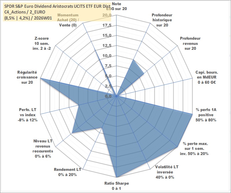 Site dédié aux investisseursPage dédiée sur site financeAnalyse des valorisations hebdomadaires du fonds SPDR S&P Euro Dividend Aristocrats UCITS ETF EUR Dist. Cet actif est cote en EUR. Les valorisations couvrent les semaines 2012W09 a 2026W01. Les revenus de cet actif financier sont pris en compte depuis la semaine 2013W11. La note ESG de cet actif n'est pas connue.