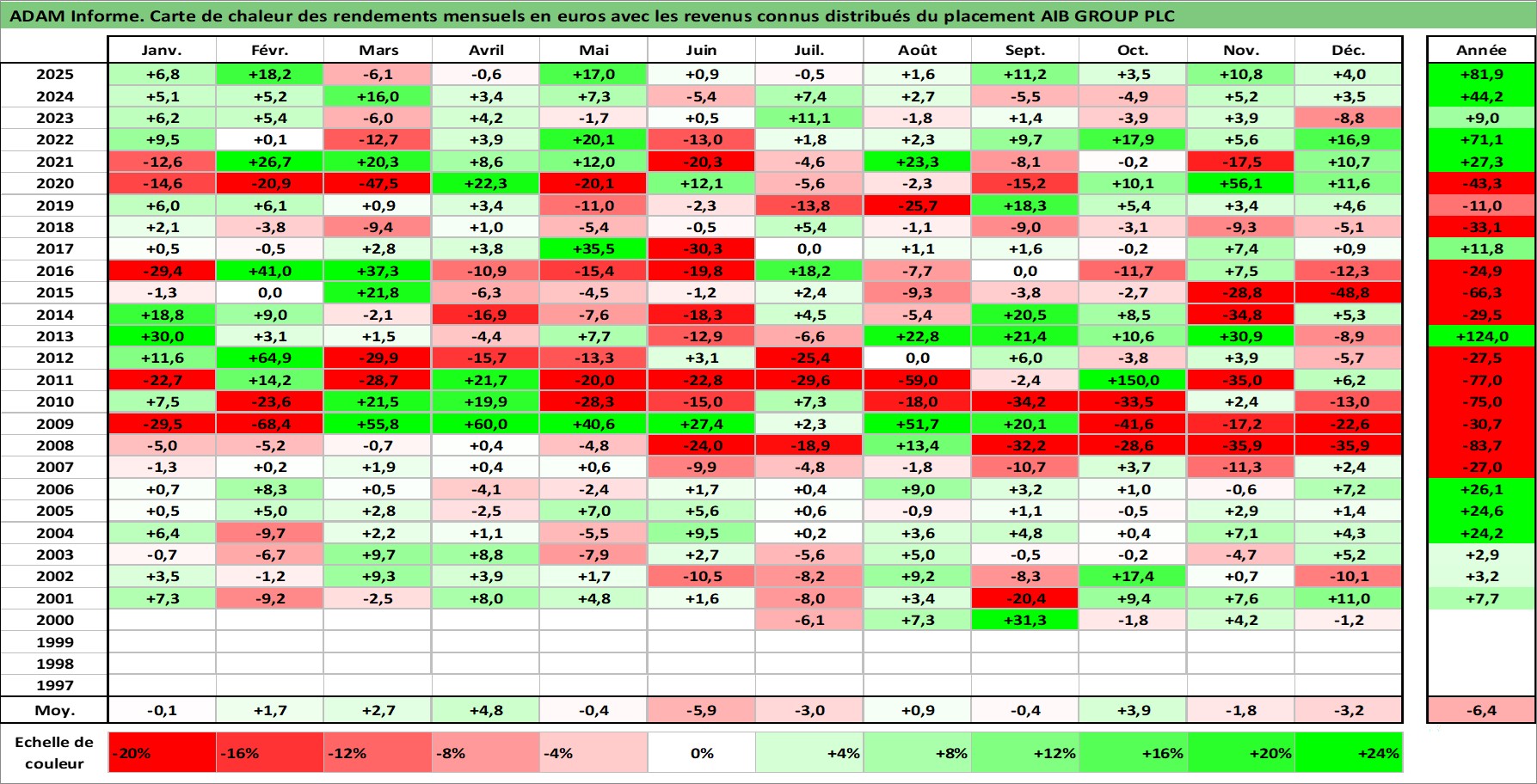 Site dédié aux investisseursPage dédiée sur site financeAnalyse des valorisations hebdomadaires de l'action AIB GROUP PLC. Cet actif est cote en EUR. Les valorisations couvrent les semaines 2000W23 a 2026W01. Les revenus de cet actif financier sont pris en compte depuis la semaine 2000W32. La note ESG de cet actif n'est pas connue.