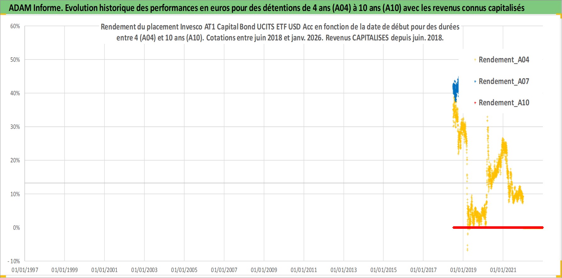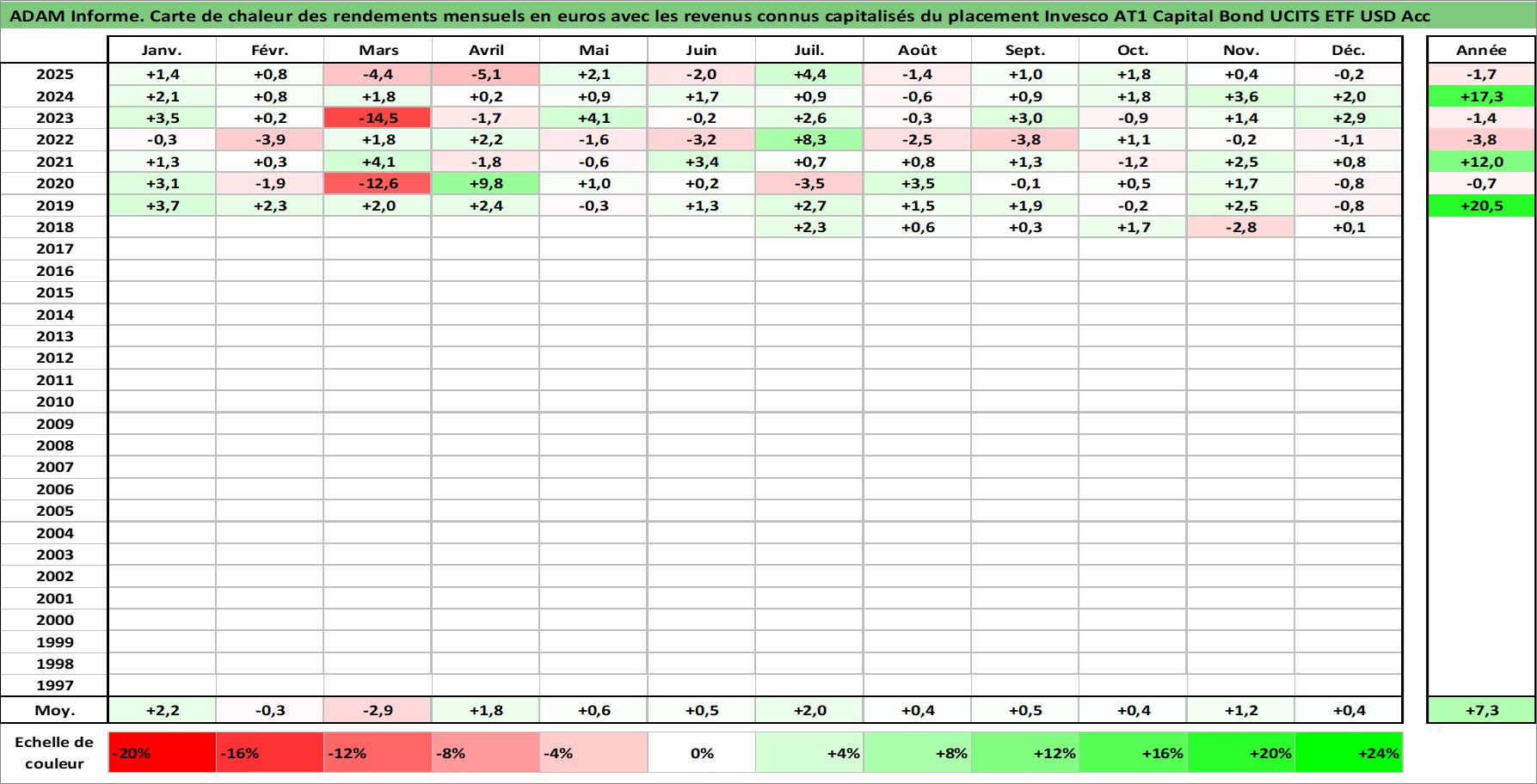 Site dédié aux investisseursPage dédiée sur site financeAnalyse des valorisations hebdomadaires du fonds Invesco AT1 Capital Bond UCITS ETF USD Acc. Cet actif est cote en USD. Les valorisations sont en contrevaleur EURO et couvrent les semaines 2018W25 a 2026W01. Les revenus de cet actif financier sont pris en compte depuis la semaine 2018W25. La note ESG de cet actif n'est pas connue.