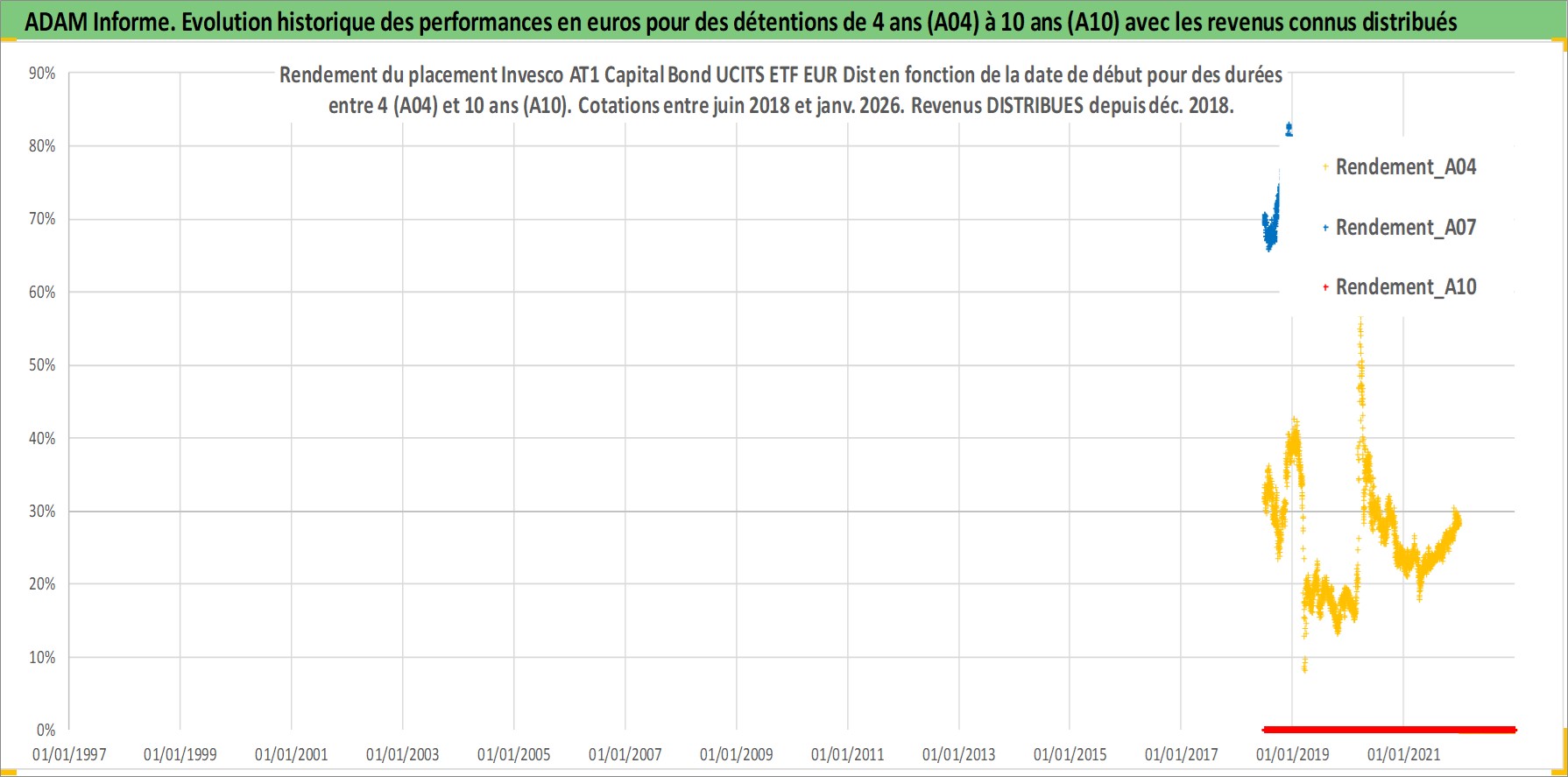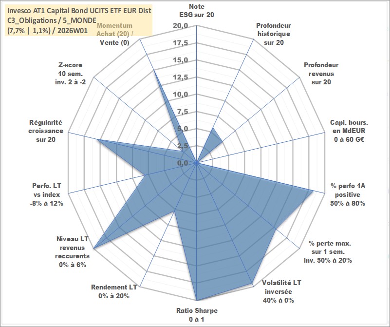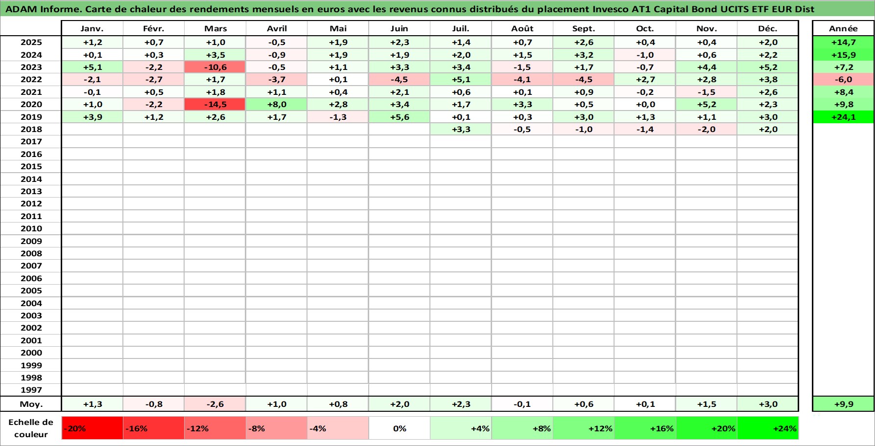 Site dédié aux investisseursPage dédiée sur site financeAnalyse des valorisations hebdomadaires du fonds Invesco AT1 Capital Bond UCITS ETF EUR Dist. Cet actif est cote en EUR. Les valorisations couvrent les semaines 2018W25 a 2026W01. Les revenus de cet actif financier sont pris en compte depuis la semaine 2018W50. La note ESG de cet actif n'est pas connue.