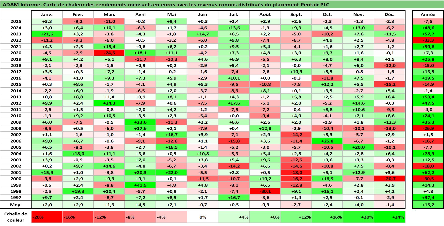 Site dédié aux investisseursPage dédiée sur site financeAnalyse des valorisations hebdomadaires de l'action Pentair PLC. Cet actif est cote en USD. Les valorisations sont en contrevaleur EURO et couvrent les semaines 1997W01 a 2026W01. Les revenus de cet actif financier sont pris en compte depuis la semaine 1997W05. La note globale ESG de cet actif est estimee a 9.0 (apres rebasage entre 0 et 20).