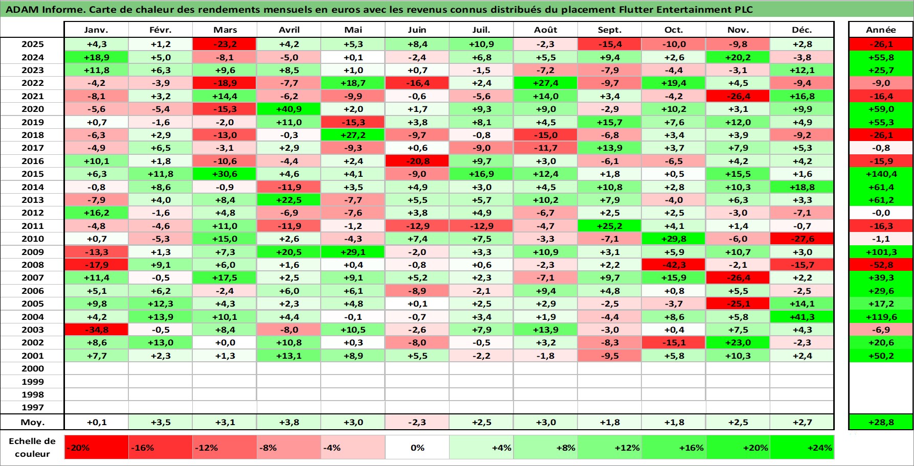 Site dédié aux investisseursPage dédiée sur site financeAnalyse des valorisations hebdomadaires de l'action Flutter Entertainment PLC. Cet actif est cote en GBX. Les valorisations sont en contrevaleur EURO et couvrent les semaines 2000W49 a 2026W01. Les revenus de cet actif financier sont pris en compte depuis la semaine 2001W09. La note globale ESG de cet actif est estimee a 7.0 (apres rebasage entre 0 et 20).
