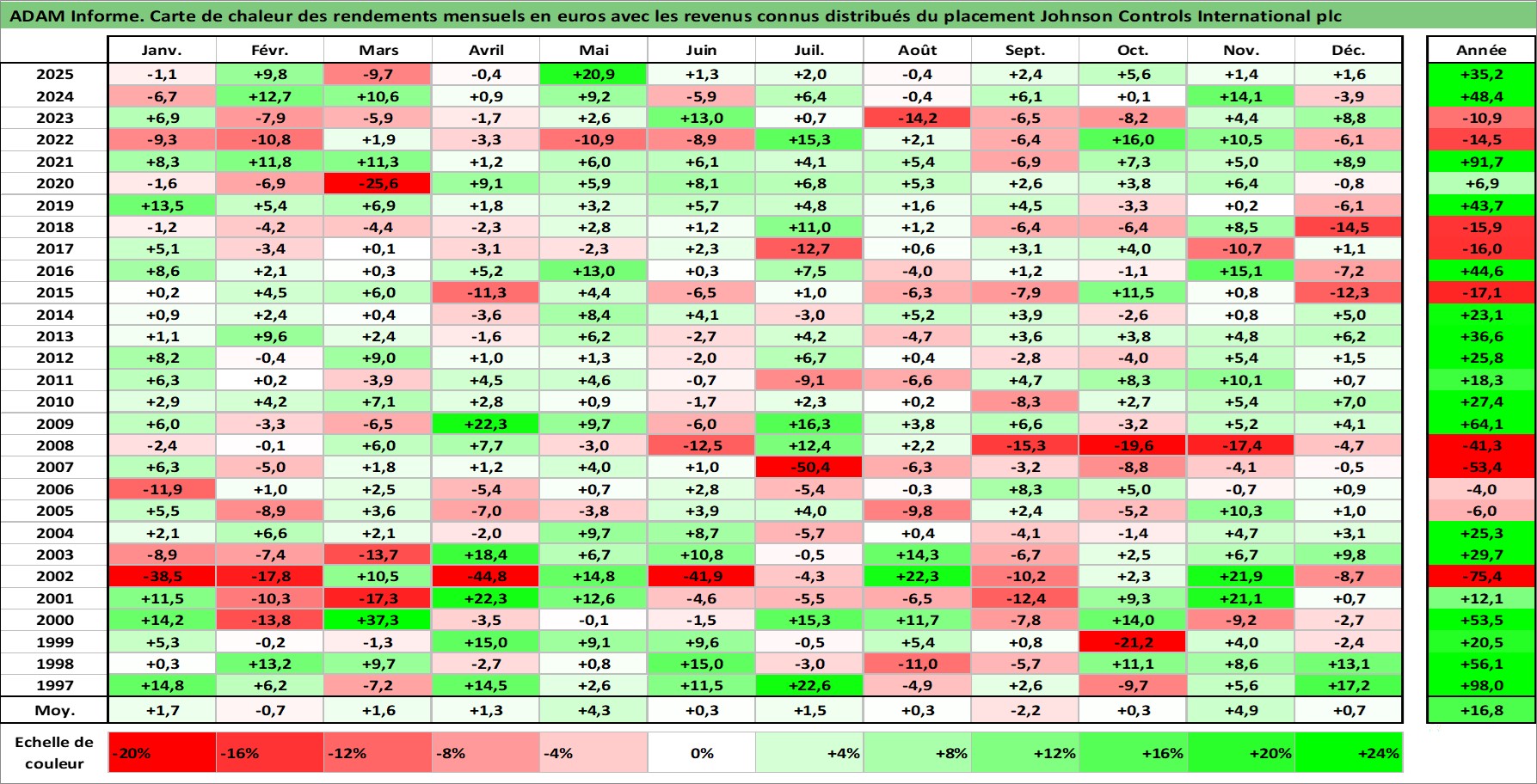 Site dédié aux investisseursPage dédiée sur site financeAnalyse des valorisations hebdomadaires de l'action Johnson Controls International plc. Cet actif est cote en USD. Les valorisations sont en contrevaleur EURO et couvrent les semaines 1997W01 a 2026W01. Les revenus de cet actif financier sont pris en compte depuis la semaine 1997W14. La note globale ESG de cet actif est estimee a 13.0 (apres rebasage entre 0 et 20).