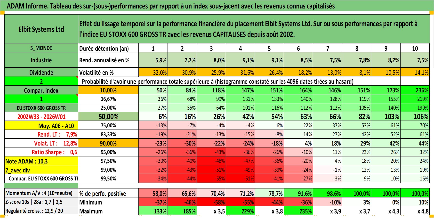 Site dédié aux investisseursPage dédiée sur site financeAnalyse des valorisations hebdomadaires de l'action Elbit Systems Ltd. Cet actif est cote en ILA. Les valorisations sont en contrevaleur EURO et couvrent les semaines 2002W33 a 2026W01. Les revenus de cet actif financier sont pris en compte depuis la semaine 2002W35. La note ESG de cet actif n'est pas connue.