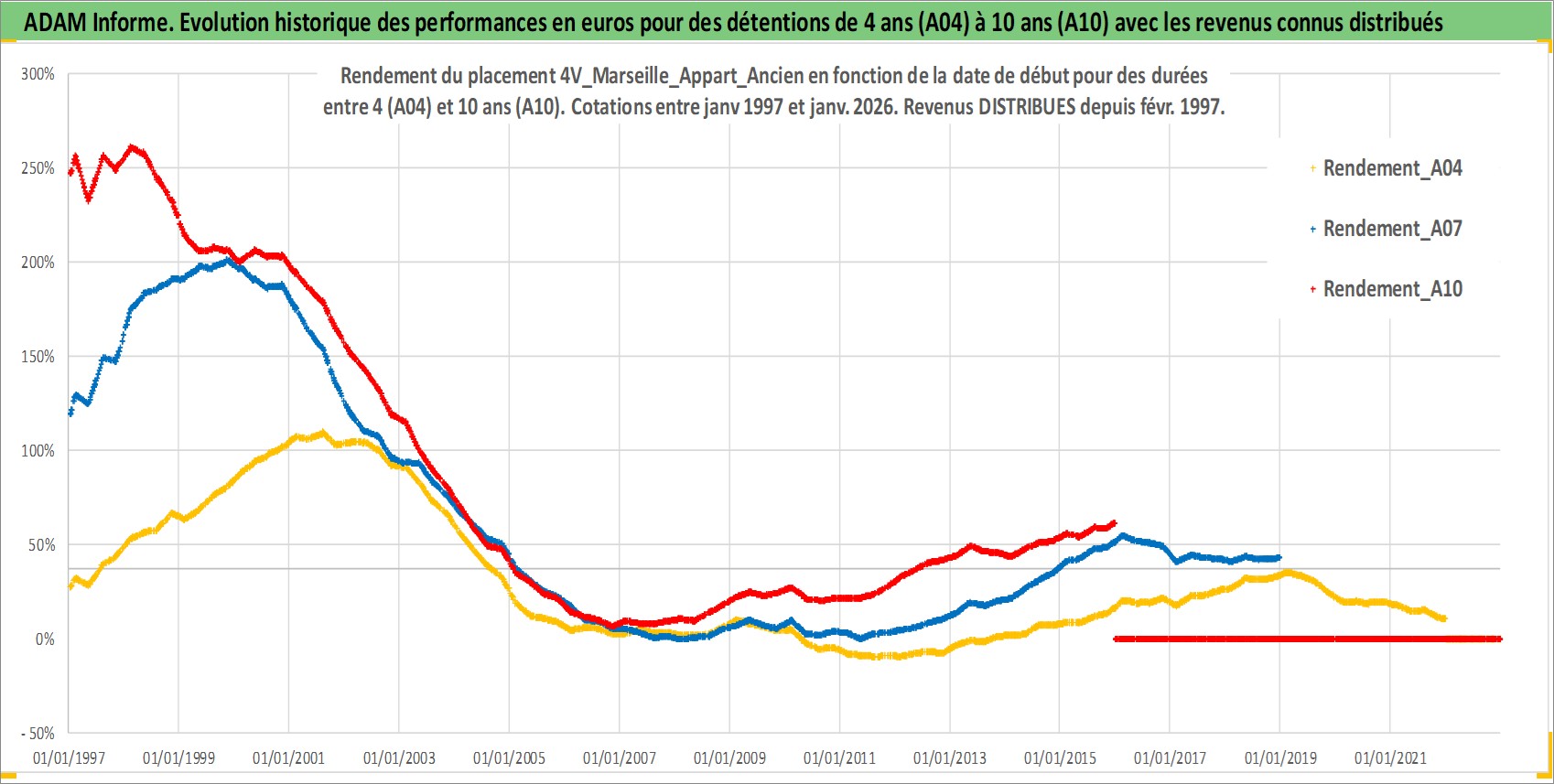 Site dédié aux investisseursPage dédiée sur site financeAnalyse des valorisations hebdomadaires de l'actif 4V_Marseille_Appart_Ancien. Cet actif est cote en EUR. Les valorisations couvrent les semaines 1997W01 a 2026W01. Les loyers de cet actif immobilier sont pris egaux a 3,33% annuels de la valeur venale du logement.