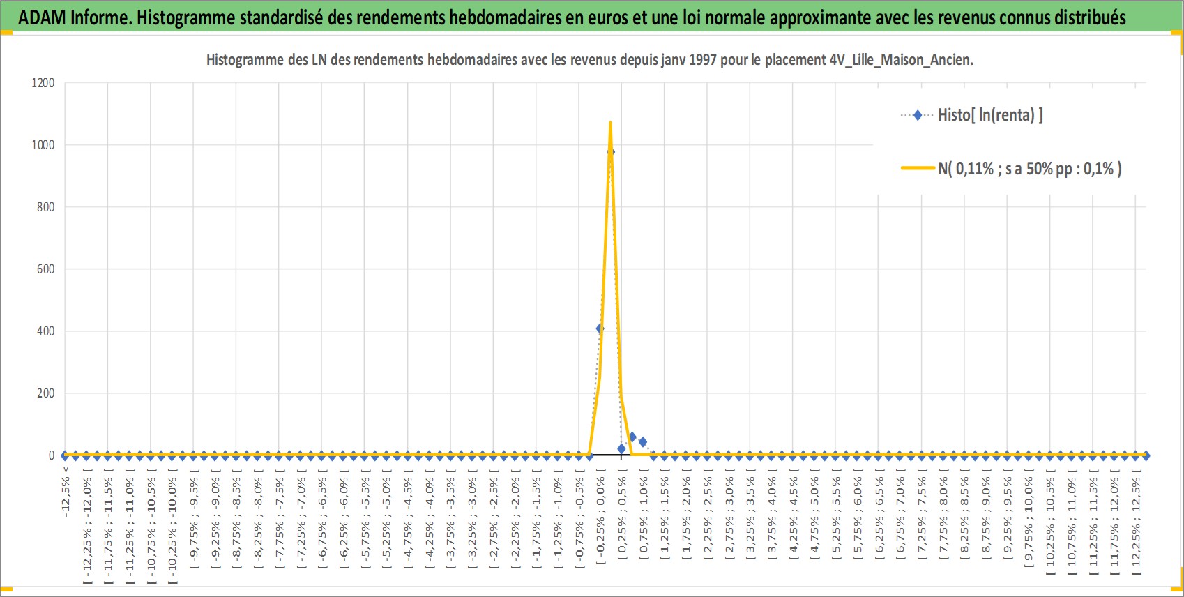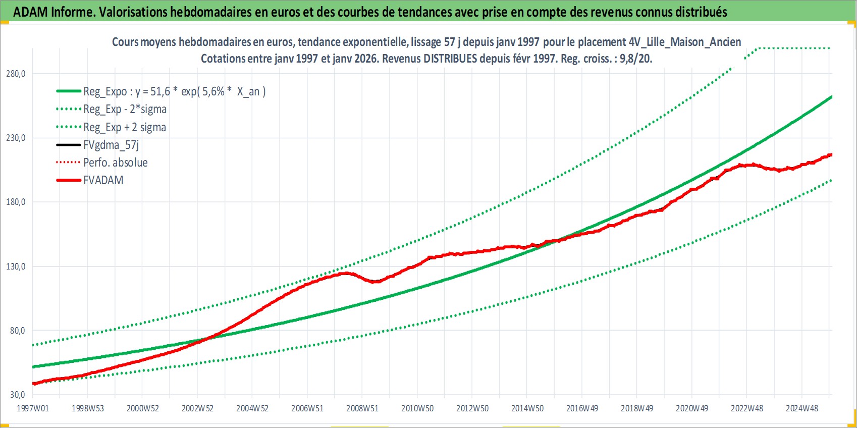 Site dédié aux investisseursPage dédiée sur site financeAnalyse des valorisations hebdomadaires de l'actif 4V_Lille_Maison_Ancien. Cet actif est cote en EUR. Les valorisations couvrent les semaines 1997W01 a 2026W01. Les loyers de cet actif immobilier sont pris egaux a 3,33% annuels de la valeur venale du logement.
