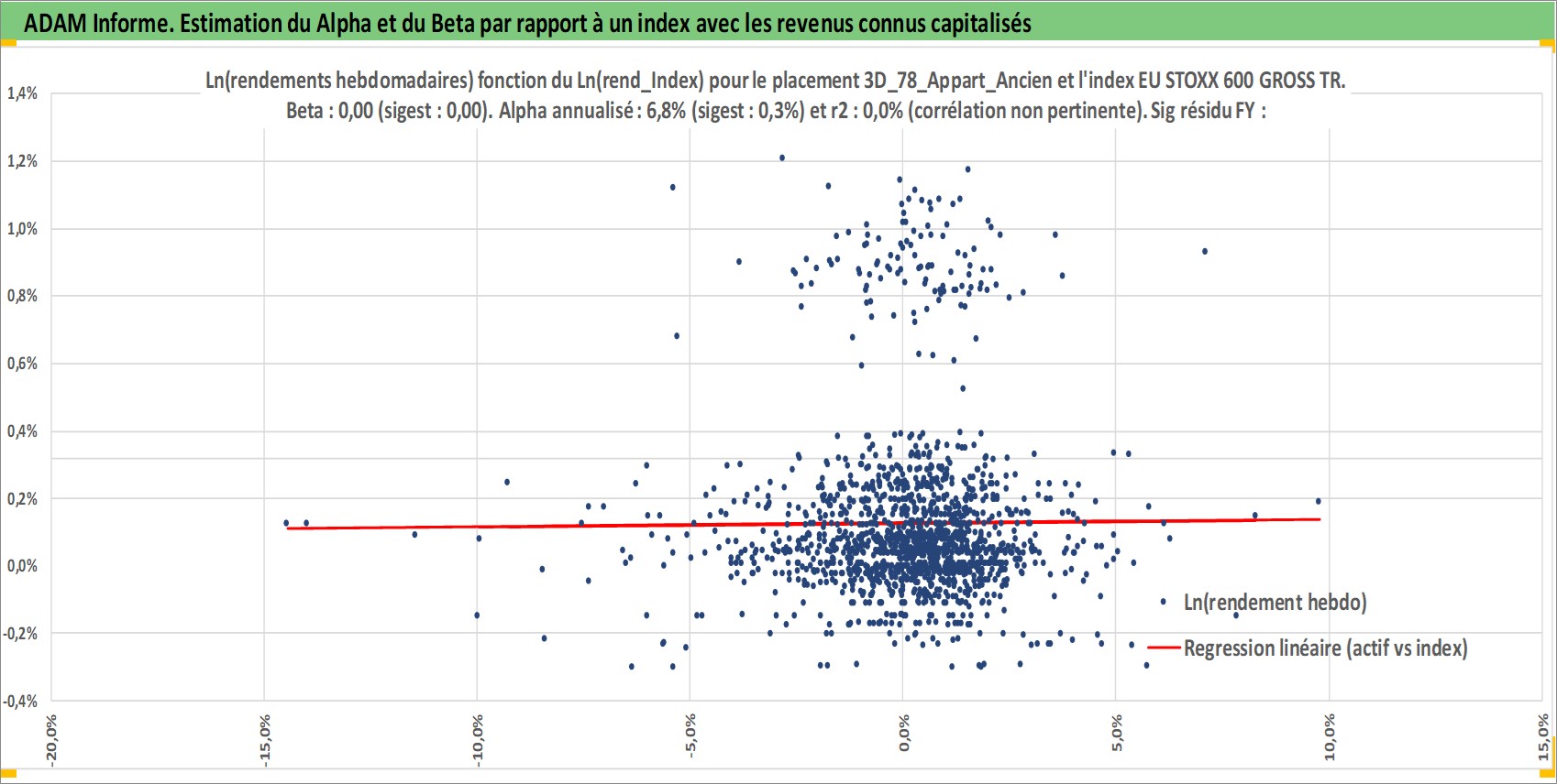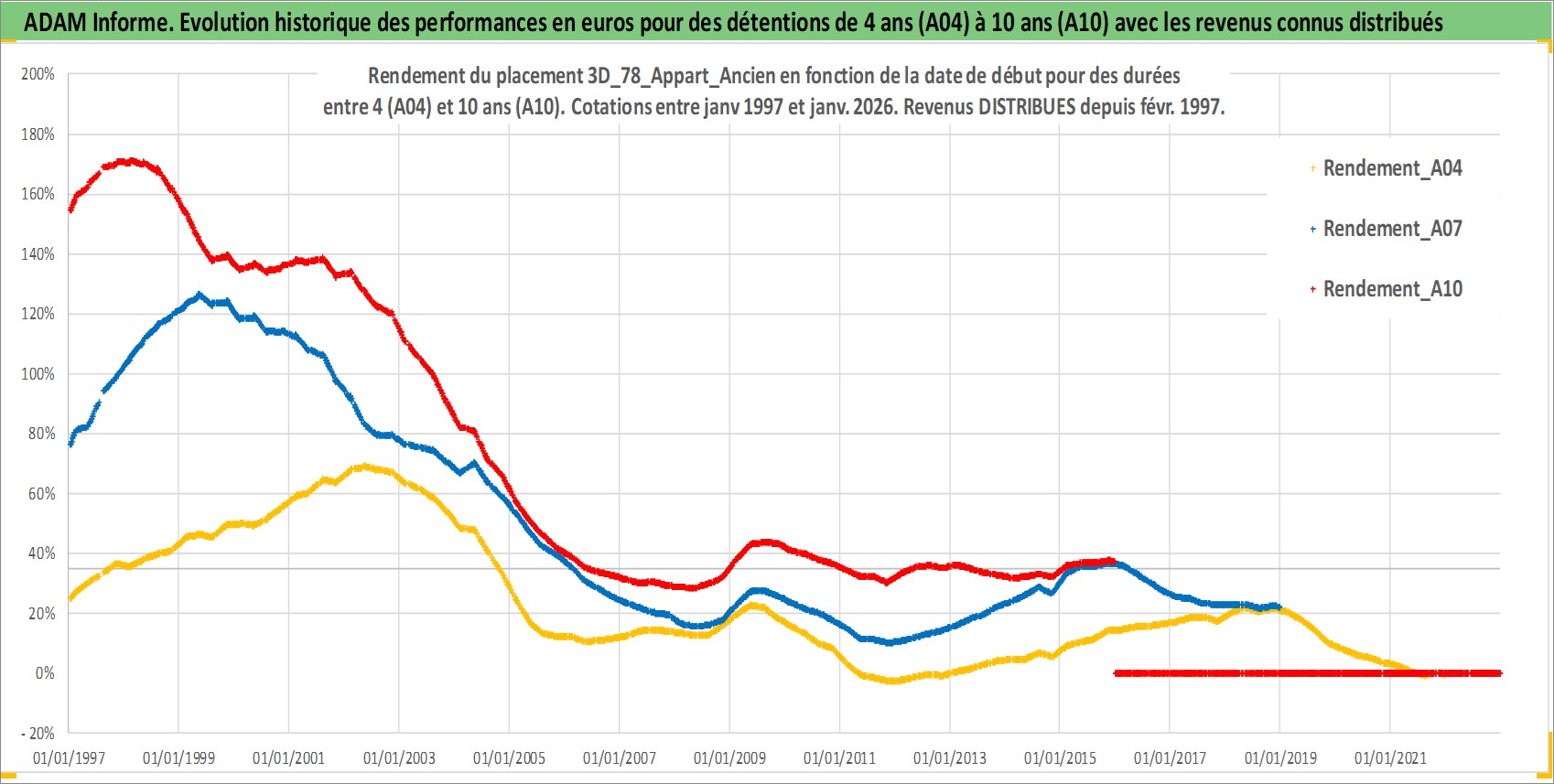 Site dédié aux investisseursPage dédiée sur site financeAnalyse des valorisations hebdomadaires de l'actif 3D_78_Appart_Ancien. Cet actif est cote en EUR. Les valorisations couvrent les semaines 1997W01 a 2026W01. Les loyers de cet actif immobilier sont pris egaux a 3,33% annuels de la valeur venale du logement.