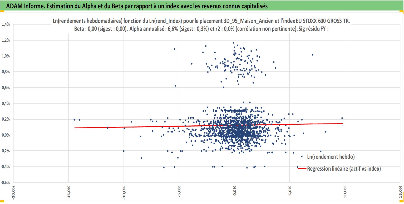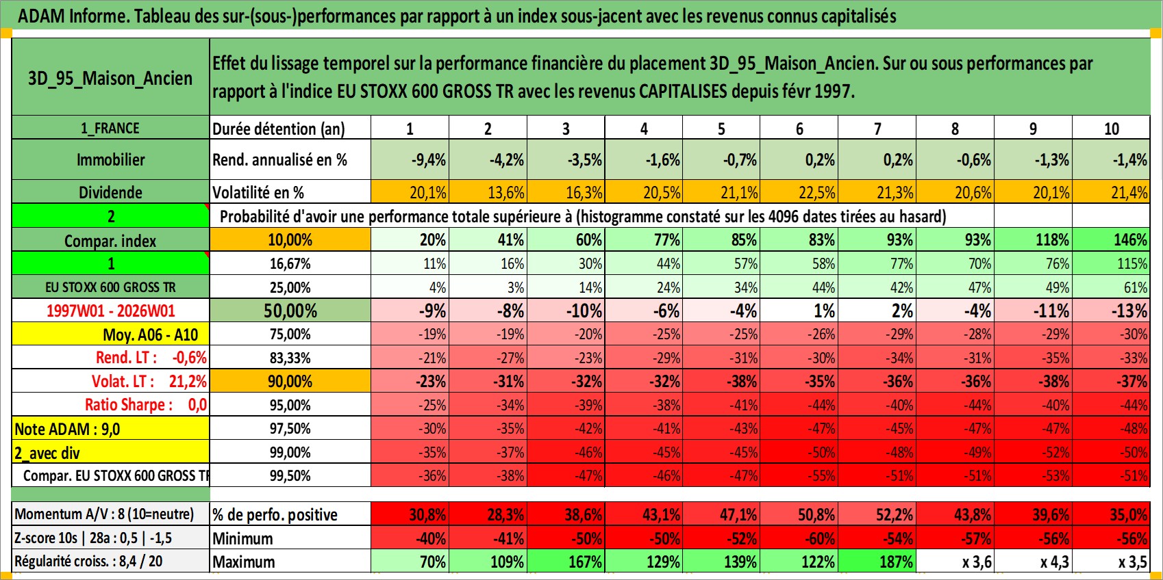 Site dédié aux investisseursPage dédiée sur site financeAnalyse des valorisations hebdomadaires de l'actif 3D_95_Maison_Ancien. Cet actif est cote en EUR. Les valorisations couvrent les semaines 1997W01 a 2026W01. Les loyers de cet actif immobilier sont pris egaux a 3,33% annuels de la valeur venale du logement.